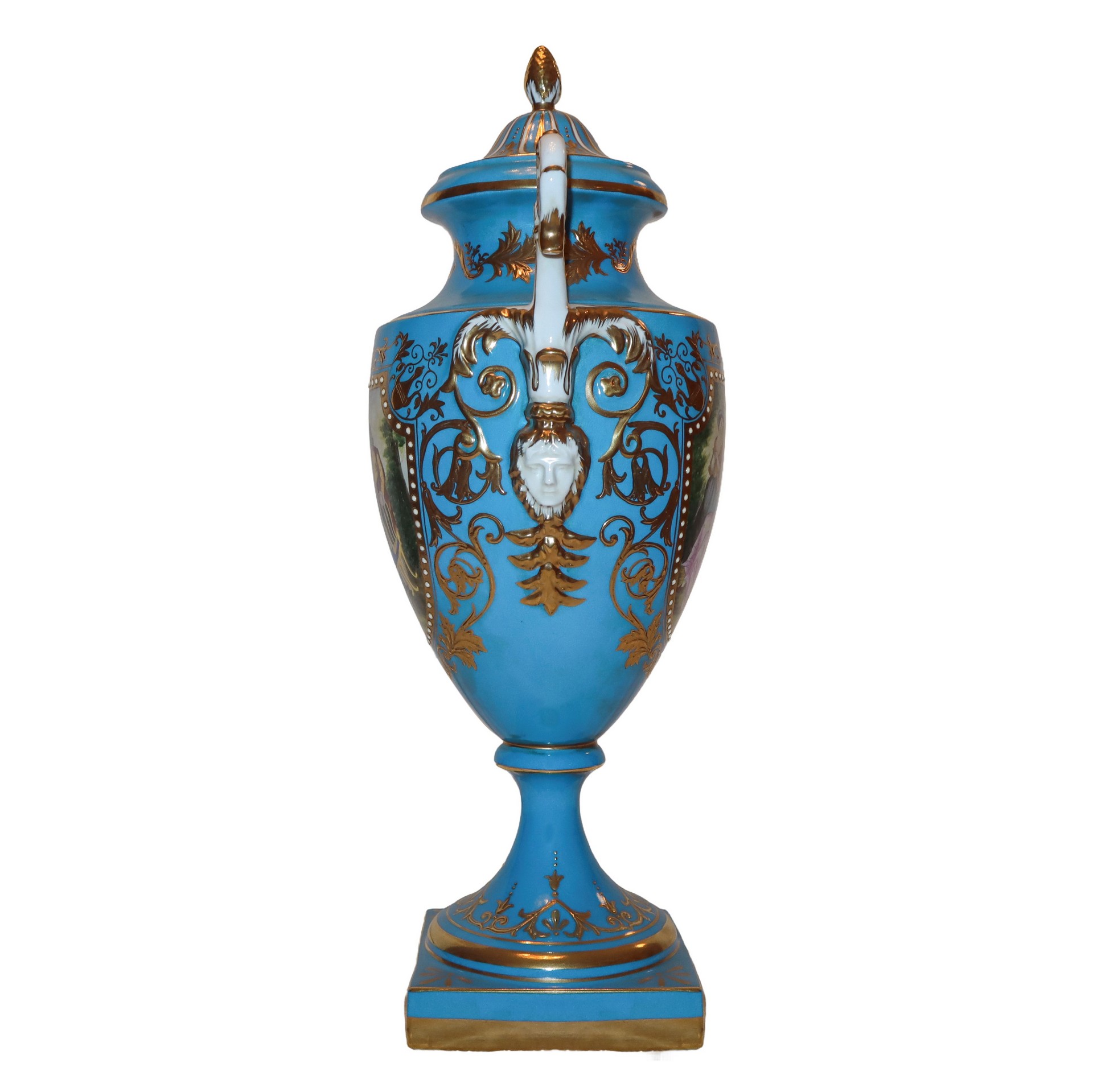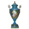 Vaso in porcellana a poutiche con manici , nello stile azzurro di Sevres, 20° secolo H 48 base 13x13 Con fondo azzurro e decori in oro, dipinto fronte e retro con scene di genere. Marchio sulla base