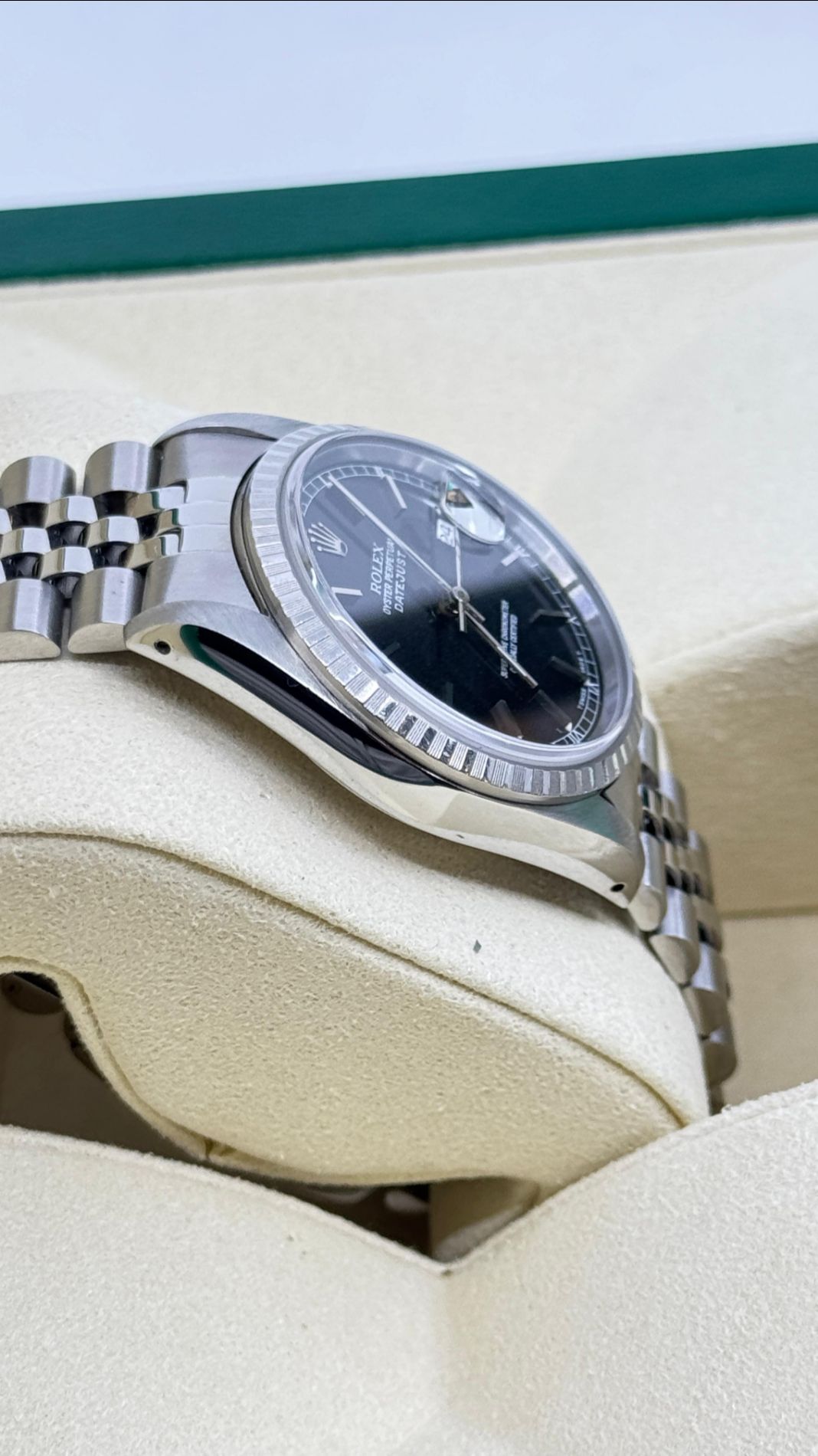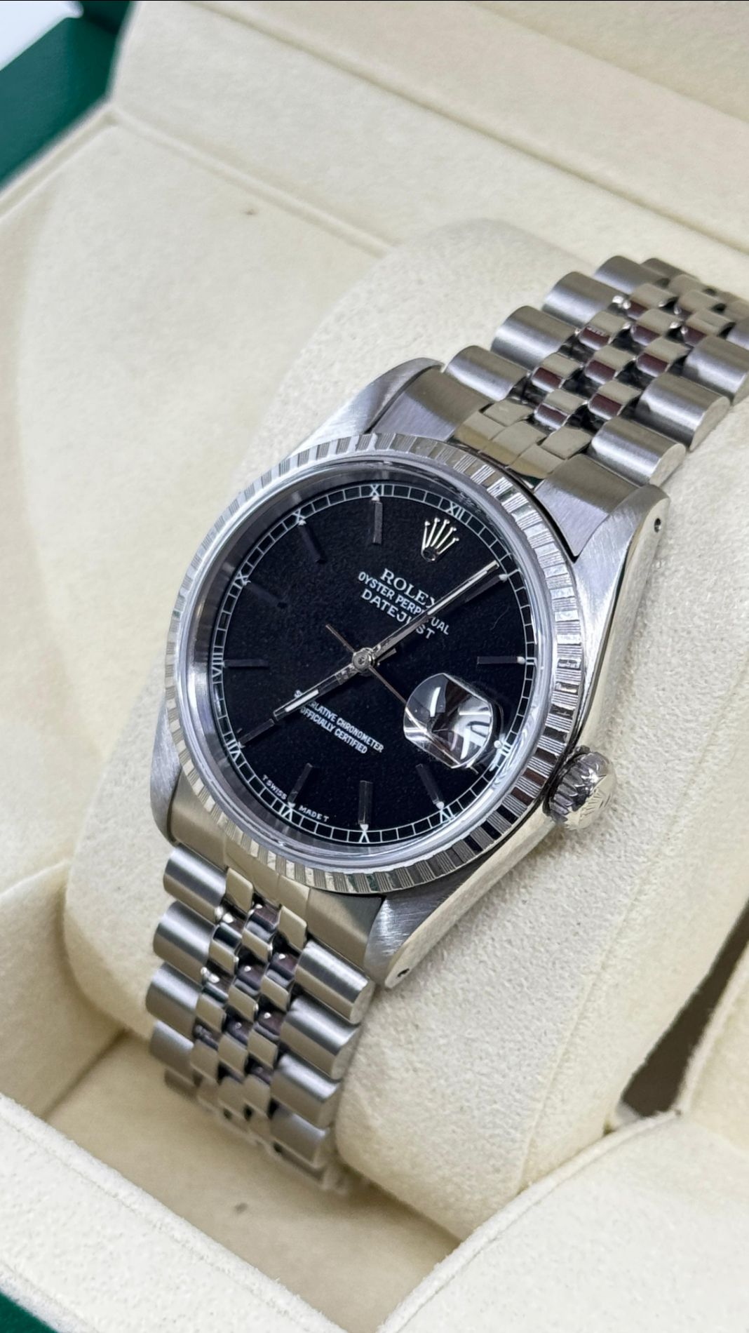 Marca Rolex Modello (Orologio) Datejust 36 Numero di referenza 16220 Anno 1992 Carica Automatico Materiale della cassa Acciaio Materiale cinturino Acciaio Condizione Ottimo (di seconda mano, segni di usura assenti o appena visibili) Corredo Senza documenti originali , senza scatola originale Un anno di garanzia del negozio Calibro Carica Automatico Materiale della cassa Acciaio Diametro 36 mm Impermeabile 10 ATM Materiale lunetta Acciaio Vetro Vetro zaffiro Cinturino Materiale cinturino Acciaio Colore cinturino Acciaio Chiusura Déployante Materiale chiusura Acciaio Funzioni Data - COMMISSIONE D’ASTA 25%