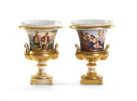 COPPIA DI VASI Coppia di vasi neoclassici in porcellana policroma e dorata. Francia. Epoca periodo del II Impero H 19,50 cm porcelain pair of vessels