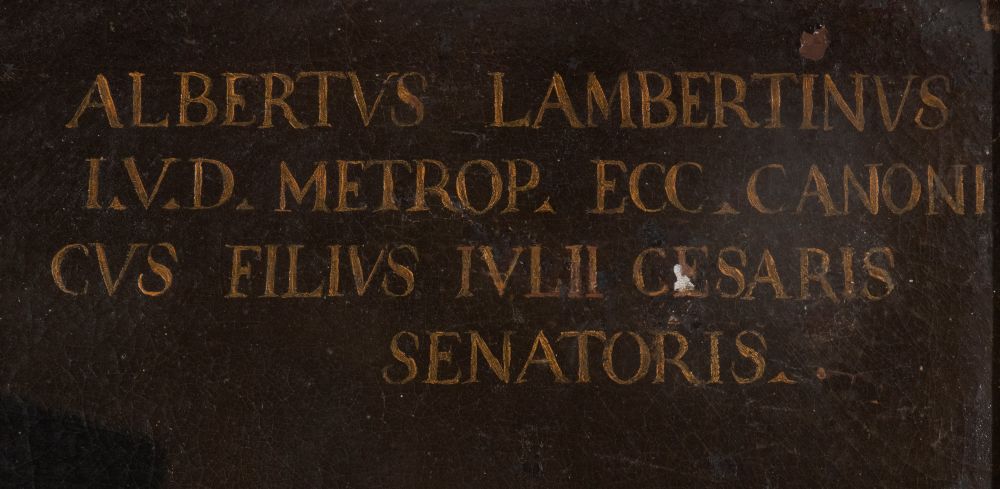 Il dipinto reca iscrizione a pennello nell'angolo superiore destro: "ALBERTUS LAMBERTINUS / I.V.D. METROP. ECC. CANONI / CUS FILIUS IULII CESARIS / SENATORIS".