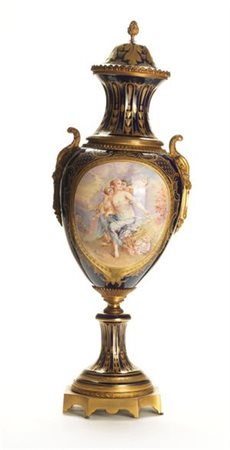 SEVRES Vaso in ceramica blu cobalto con due miniature, una firmata Rochette. Francia manifattura di Sevres. Epoca fine del XX secolo H 74 cm An important blue and gold decorated Sevres ceramic vase with central romantic scene, France Napoleon III