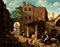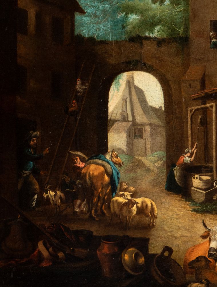 Scena di cortile con figure, animali e chiesa sullo sfondo