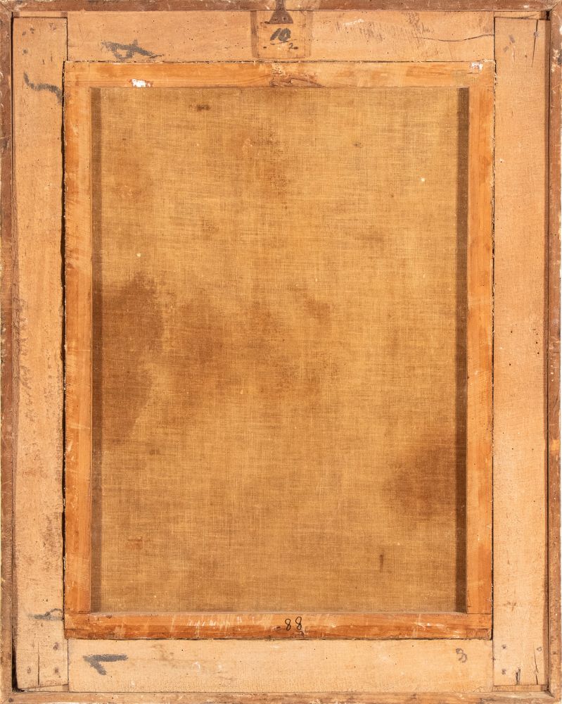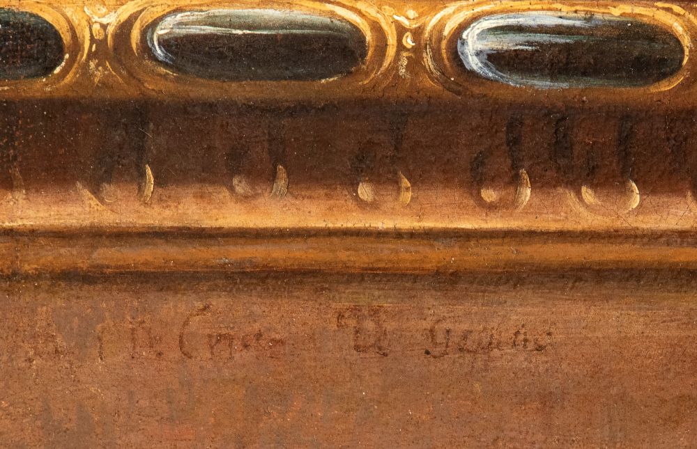 La tela reca tracce di iscrizione parzialmente illegibile al margine inferiore sinistro, in corrispondenza del mobile.