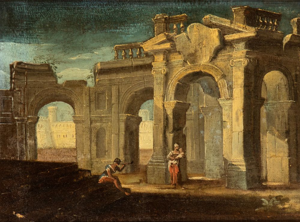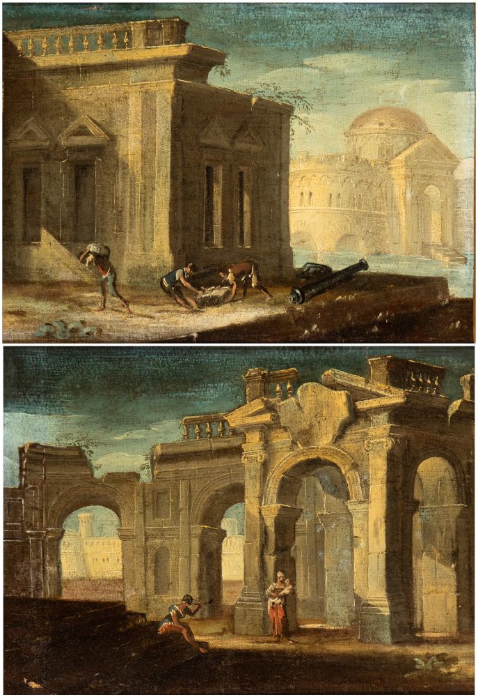 a) Capriccio architettonico con tre figure ed un cannone; b) Capriccio architettonico con una figura seduta e una donna con bambino. Coppia di dipinti