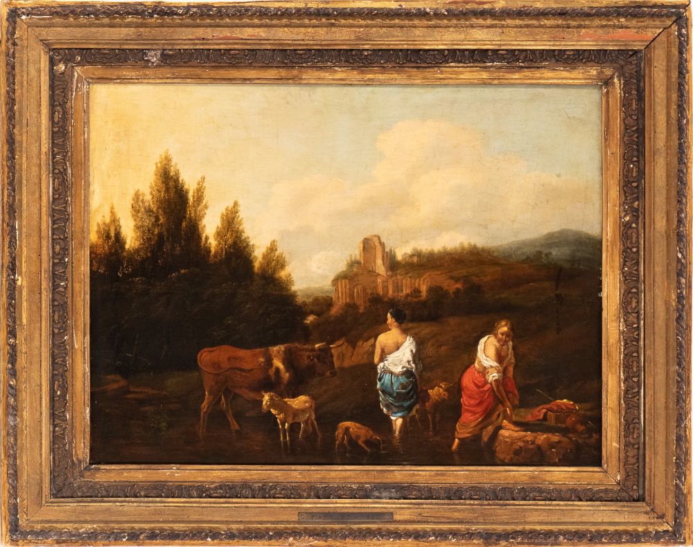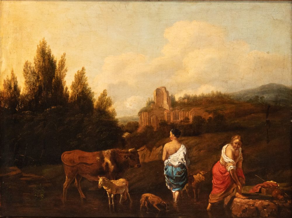 Paesaggio con pastorelle, animali e rovine sullo sfondo