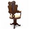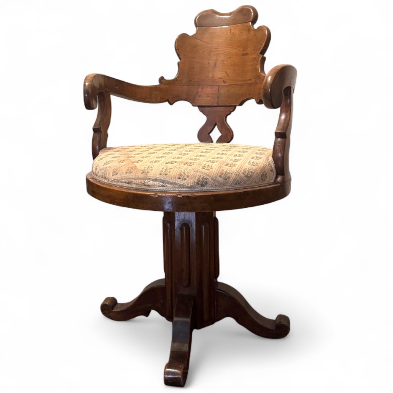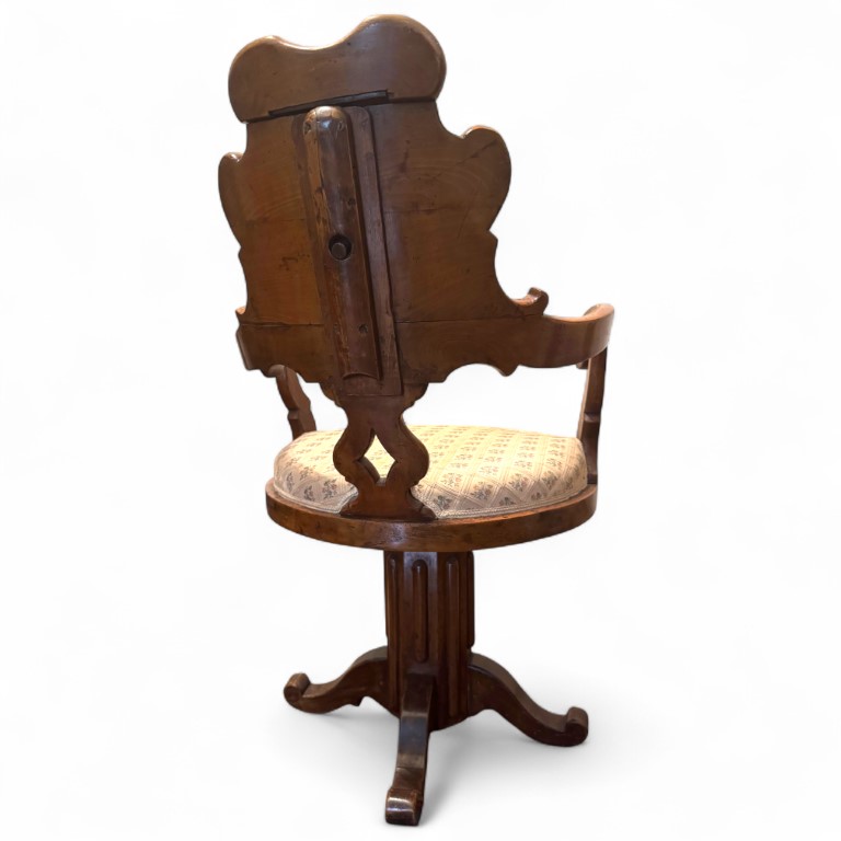Spalliera sagomata, braccioli mossi a giorno su fusto tornito con quattro gambe mosse.