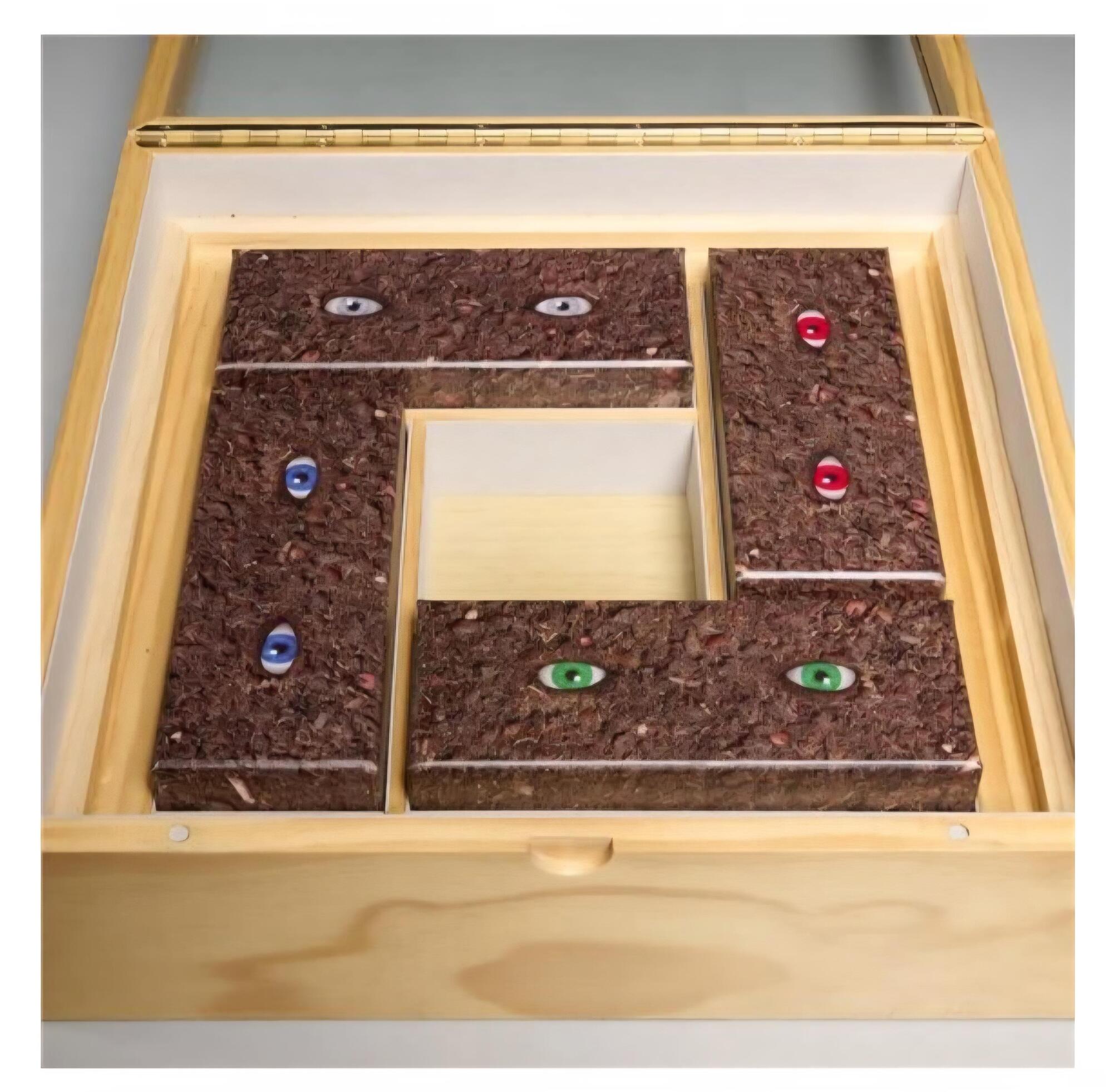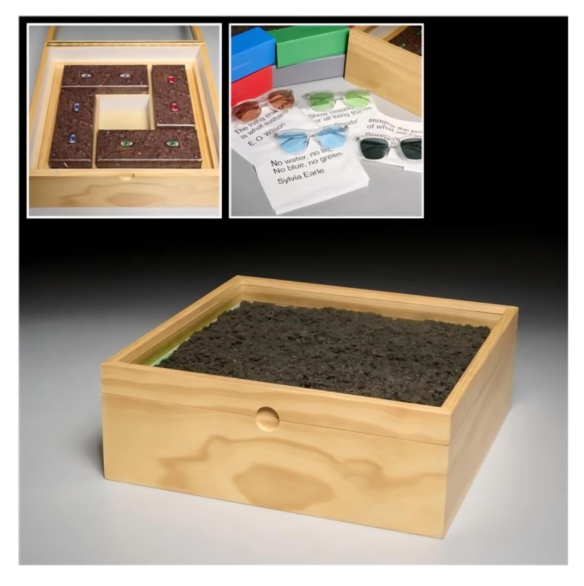 UGO RONDINONE, 34 X 34 X12 cm, titolo “ SEE A CLEAN FUTURE LANDSCAPE 2019”, scatola in legno contenente vari oggetti numerata 44/100 firmata e datata