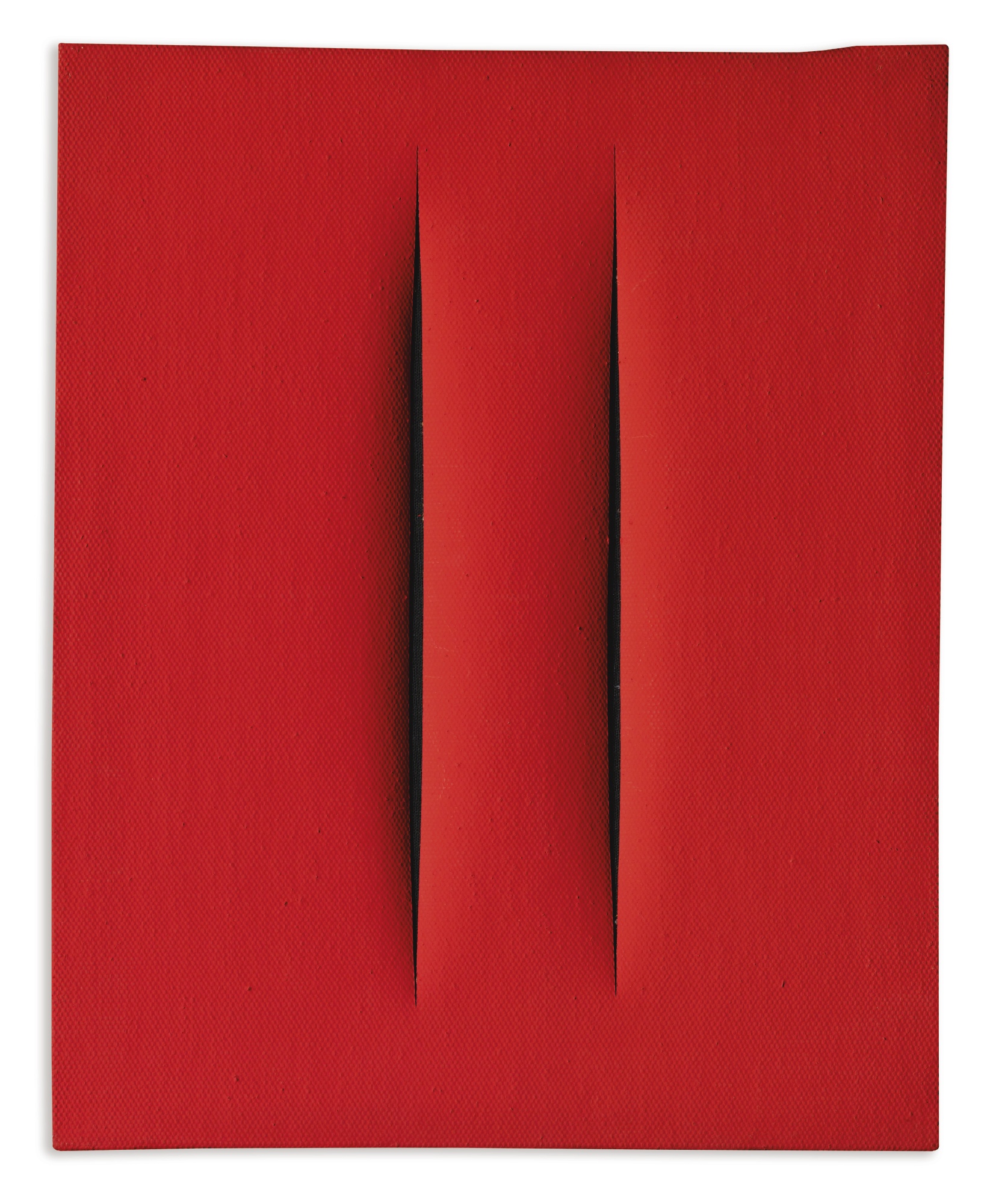 Lucio Fontana 1899 - 1968 CONCETTO SPAZIALE. ATTESE firmato, intitolato e iscritto sul retro l’america [sic] è stata / scoperta da Garibaldi…/ asino! idropittura su tela cm 41x34 Eseguito nel 1964-65 Authentication Opera registrata presso la Fondazione Lucio Fontana, Milano, con il n. 1604/1 L’opera è accompagnata da certificato su fotografia rilasciato dalla Fondazione Lucio Fontana, Milano Provenance Acquistato dall’attuale proprietario direttamente dall’artista Literature Enrico Crispolti, Lucio Fontana. Catalogo generale, Milano 1986, vol. II, p. 546, n. 64-65 T 1, illustrato Enrico Crispolti, Lucio Fontana. Catalogo ragionato di sculture, dipinti, ambientazioni, Milano 2006, vol. II, p. 732, n. 64-65 T 1, illustrato