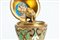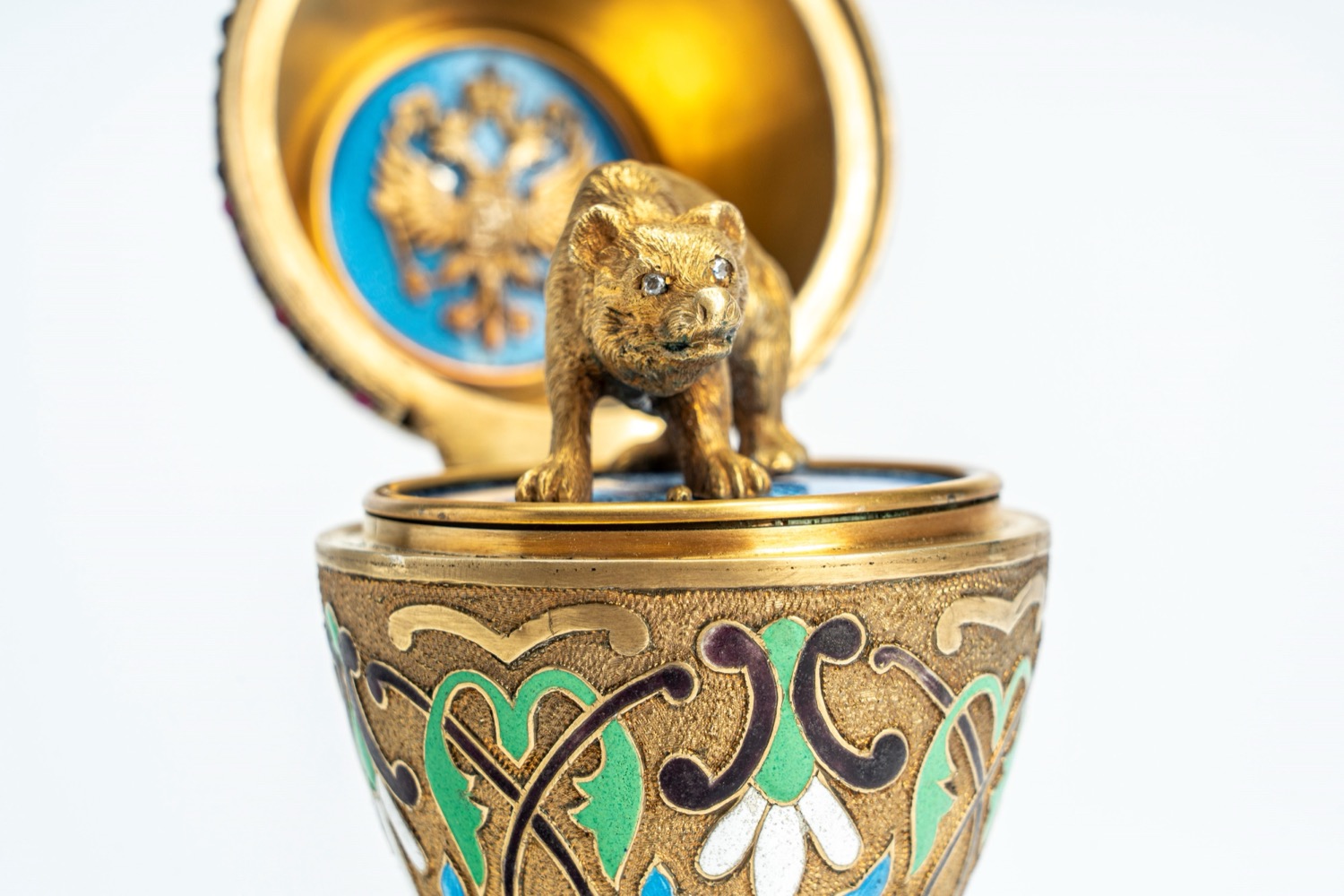 Coperchio apribile con fregio interno ad aquila bicefala imperiale, celante sorpresa a forma di orso. Reca punzone «К.ФАБ», con marchio dell’assaggiatore datato 1894 e titolo 84 zolotniki.Coperchio apribile con fregio interno ad aquila bicefala imperiale, celante sorpresa a forma di orso. Reca punzone «К.ФАБ», con marchio dell’assaggiatore datato 1894 e titolo 84 zolotniki.
