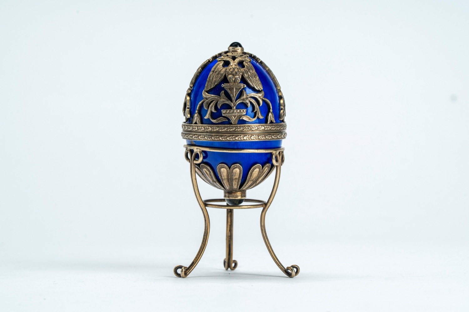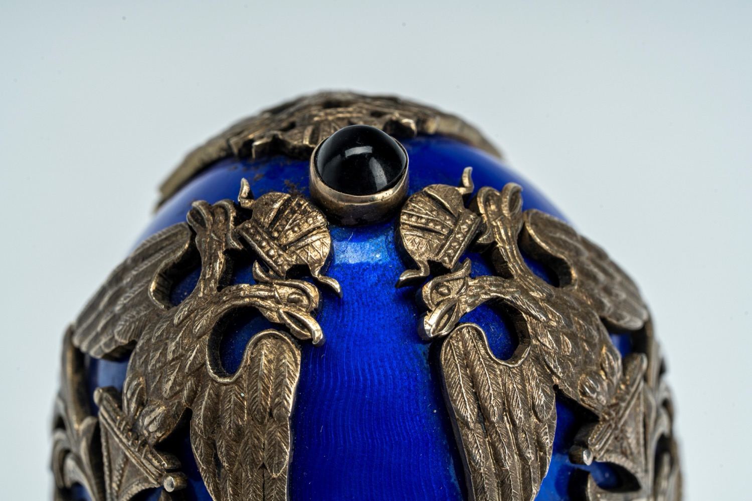 Uovo in argento, argento dorato e smalto guilloché blu con coperchio incernierato. Russia, fine XIX secolo