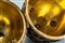 Decorato con tre fregi ad aquile bicipiti imperiali e due cabochon. Poggiante su sostegno tripode. Reca un punzone parzialmente abraso e il punzone «I.P.» dell’argentiere Julius Rappoport, titolo 84 zolotniki.