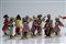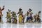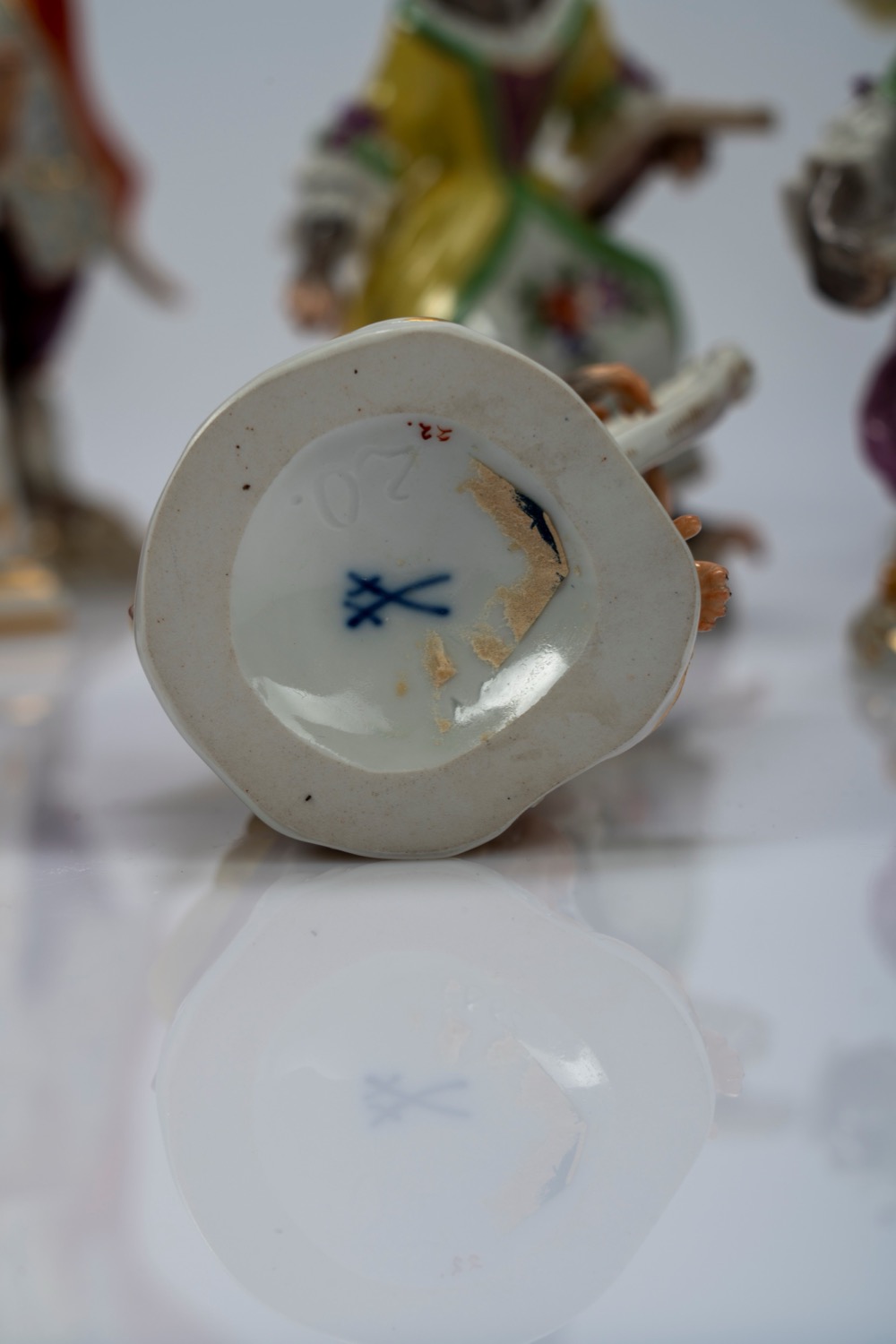 Marchio di fabbrica, numeri impressi e dipinti in oro e/o rosso sotto le basi.Poggianti su base a rocaille. L'orchestra, da un modello creato da Johann Joachim Kaendler nel 1753 e rivisto nel 1765 con Peter Reinicke, è composta da ventuno figure di musicanti e un leggio. L’ensemble comprende: clavicembalista, liutista, suonatore di cornamusa scozzese, chitarrista, percussionista al triangolo, direttore d’orchestra, violoncellista, batterista, assistente, arpista, tamburino (tamburo laterale a spalla), soprano, violinista, oboista, trombettista, due coriste con spartito, cornista (con corno francese), flautista, flautista traverso e cantante.