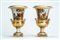 Coppia di vasi biansati ad anfora in porcellana a fondo oro e bordeaux con scene agresti policrome, su basi quadrate. Francia, prima metà secolo XIX