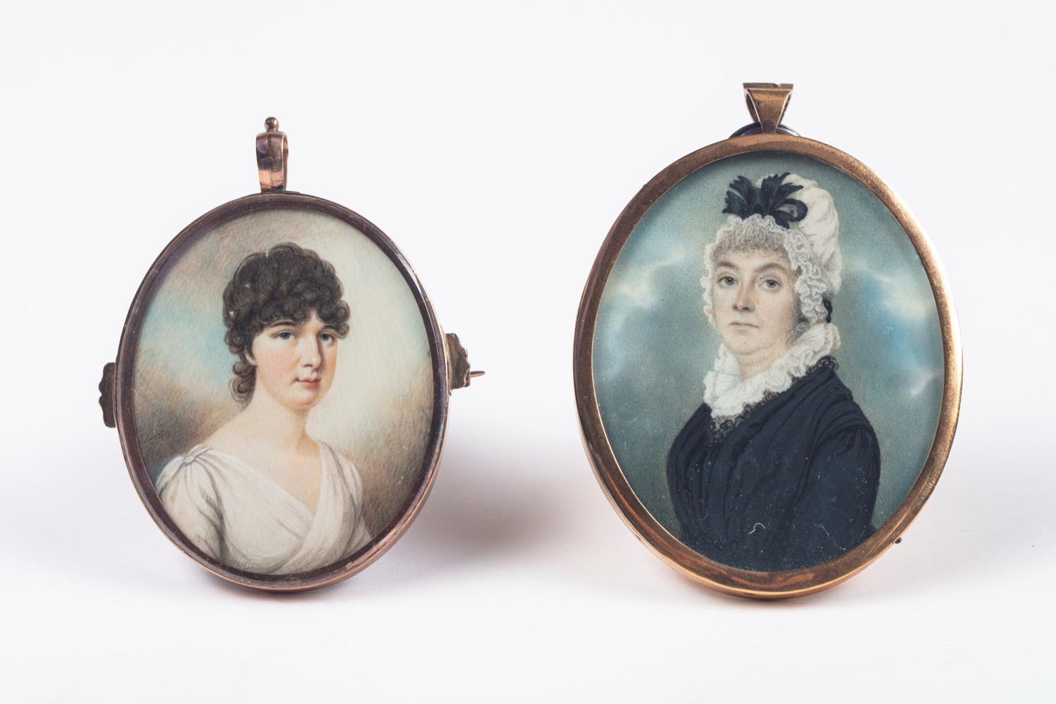 raffiguranti giovane donna con veste bianca e gentildonna in abito nero con cuffia e fiocco. Entro cornici a pendente una in metallo dorato e l'altra in oro 9 K.