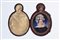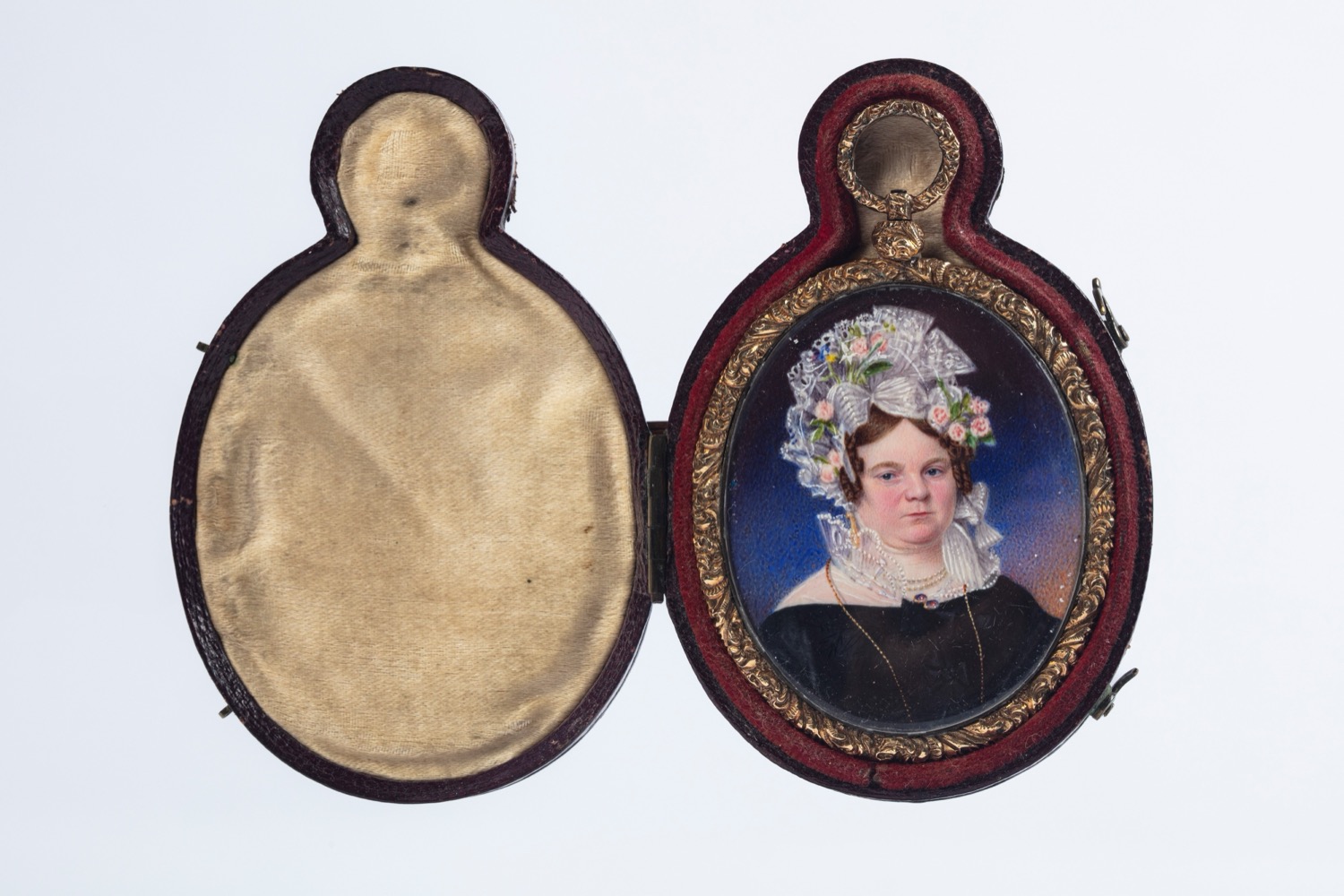 raffigurante gentiluomo con occhiali e gentildonna con cuffia a fiocchi e fiori, fili di perle e catena d’oro (cm 5x4) in cornice a pendente in lastra d’oro sbalzata e cesellato a volute (cm tot. 7,5x5). Entro custodia sagomata rivestita in cuoio.