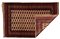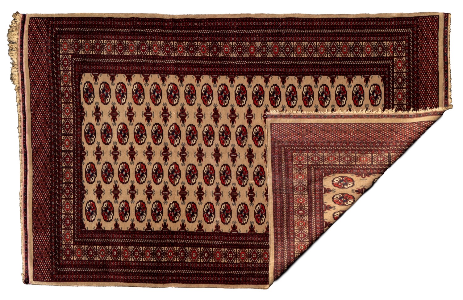 fondo avorio a gul ovali in file regolari con motivi secondari a forma di stella, bordure multiple su fondo bruno con elementi geometrici ripetuti. Lievi difetti.fondo avorio a gul ovali in file regolari con motivi secondari a forma di stella, bordure multiple su fondo bruno con elementi geometrici ripetuti. Lievi difetti.