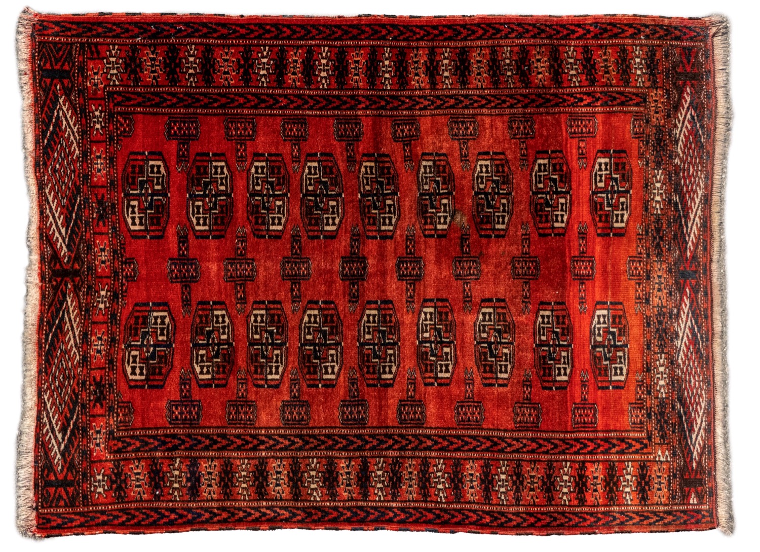 fondo rosso con file di gul allungati, bordure geometriche multiple.