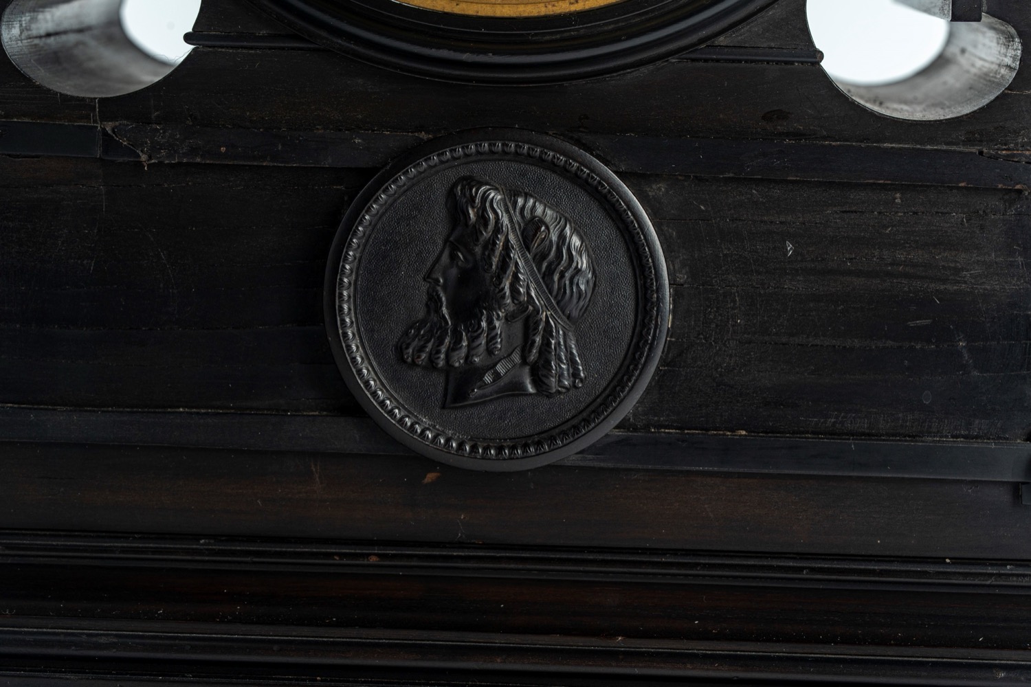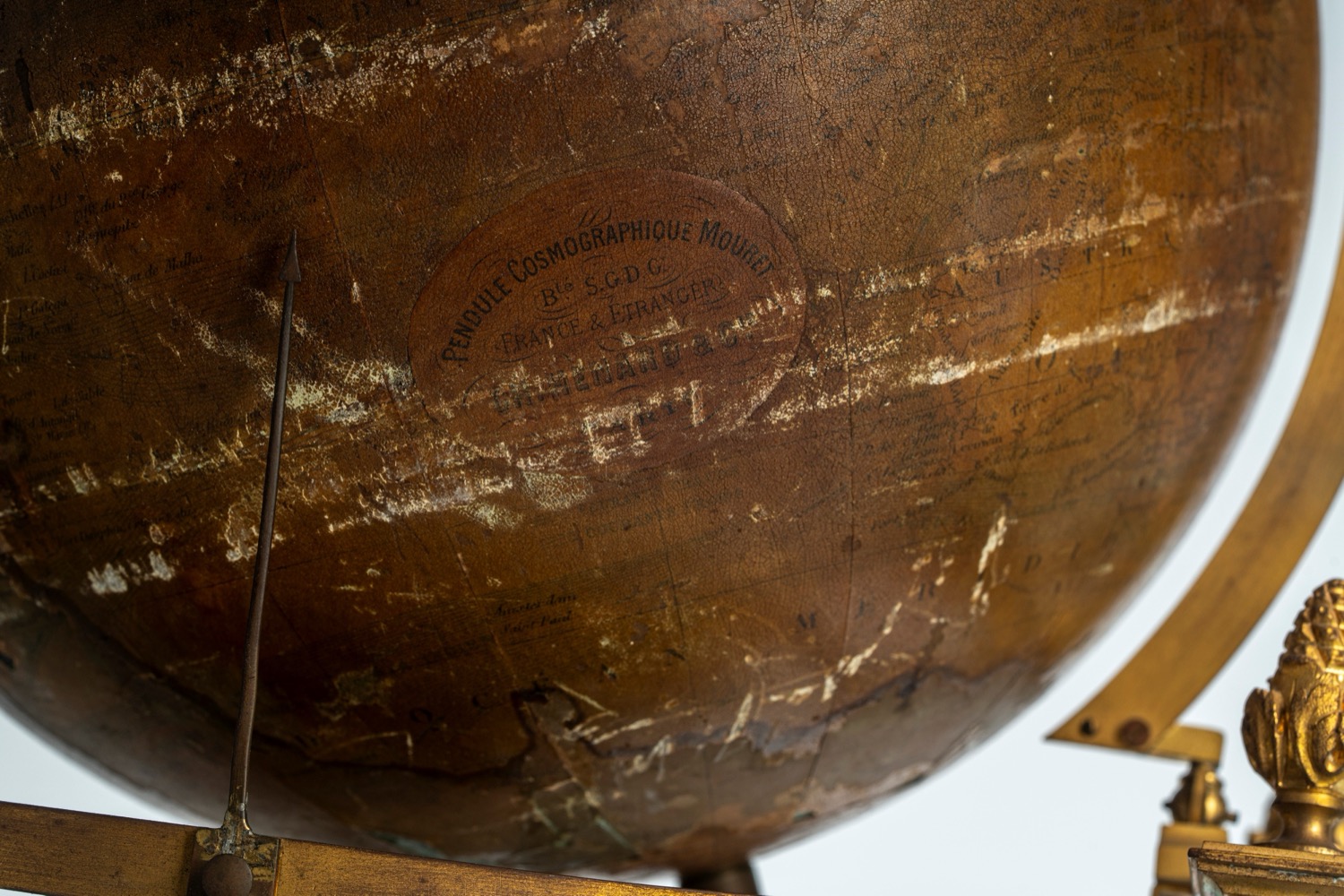 Difetti, restauri (manca il disco del calendario annuale).Cassa a plinto in legno ebanizzato, sormontata da quadrante in smalto bianco a cifre romane. Globo con cartiglio “Pendule Cosmographique Mouret B.S.G D.C. France & Étranger …”.