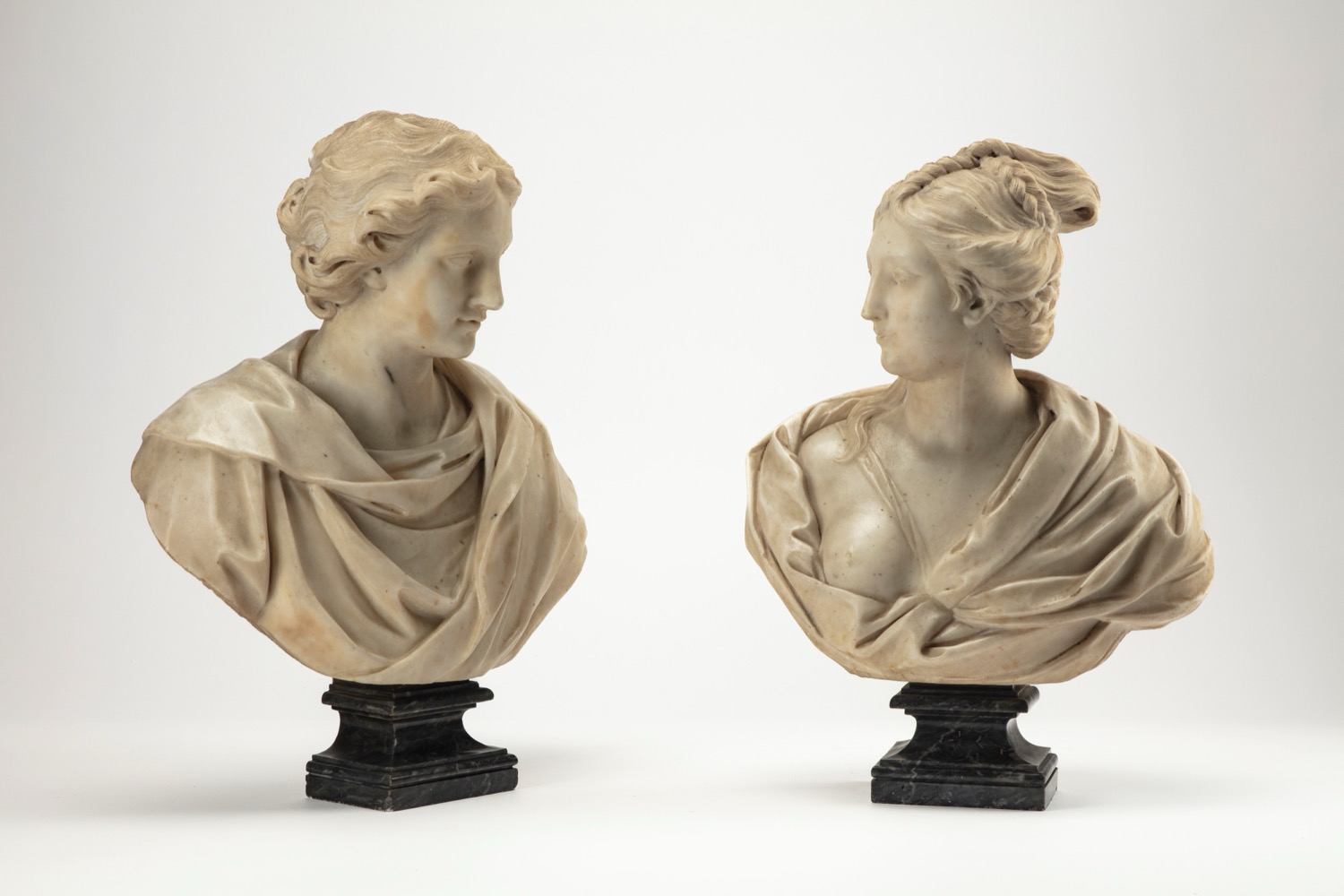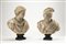 Coppia di busti ammantati in marmo poggianti su colonne in scagliola a finto marmo, XVIII secolo