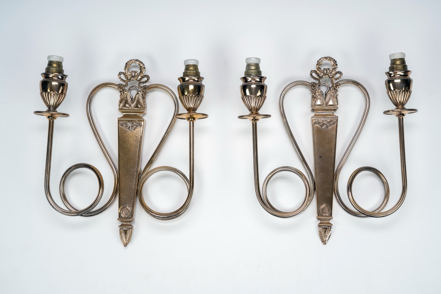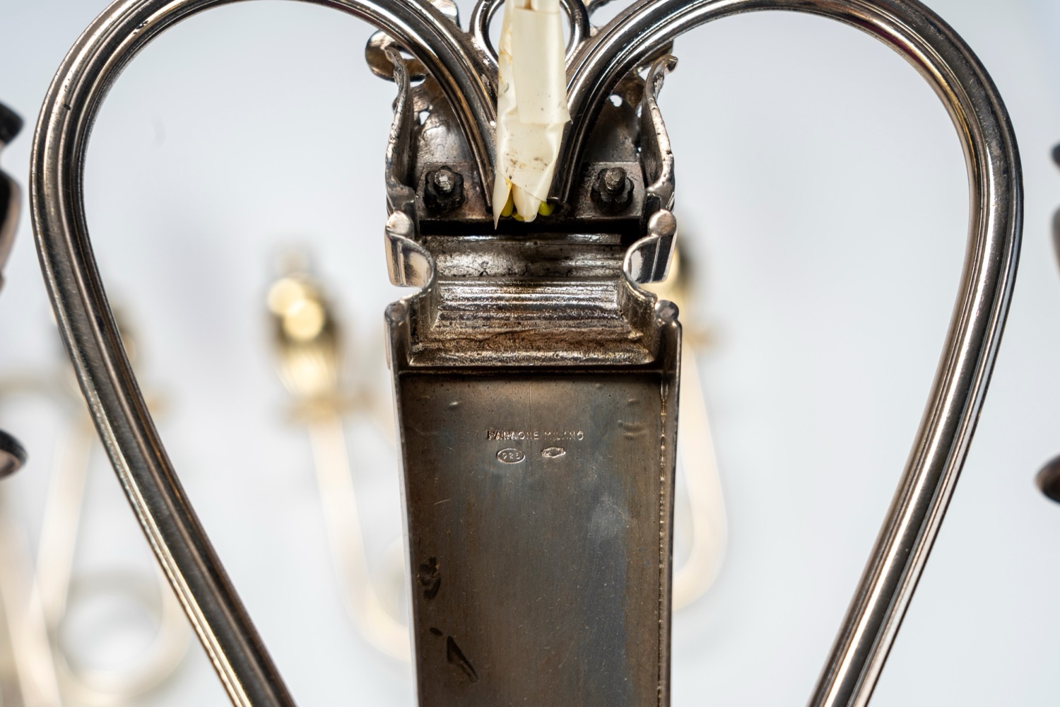 Coppia di appliques a due luci in argento 925. Milano, Faraone, secolo XX