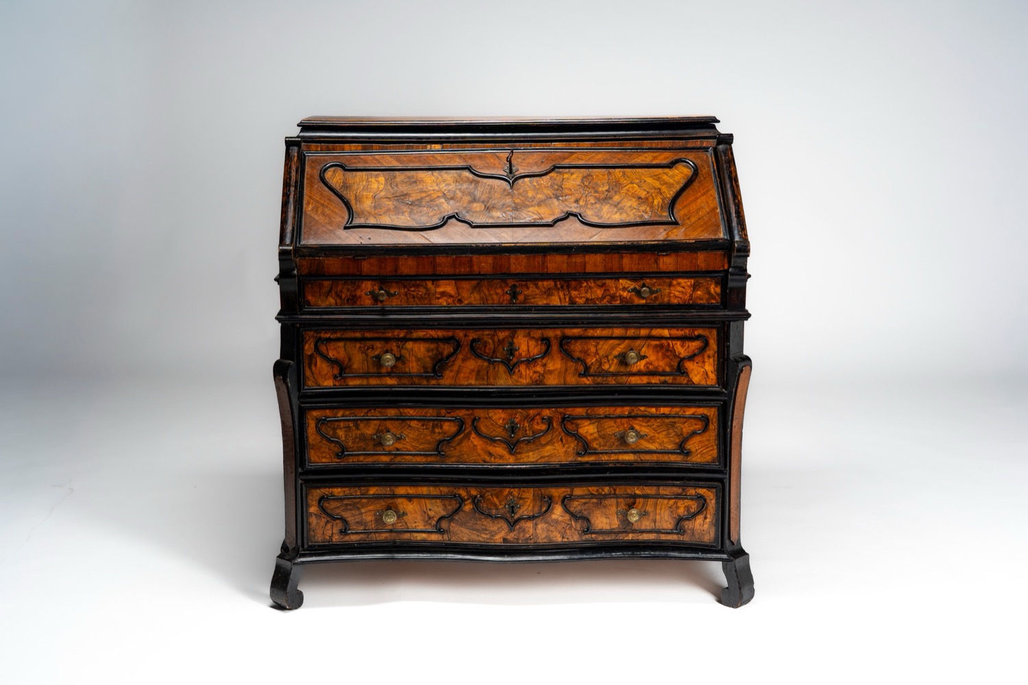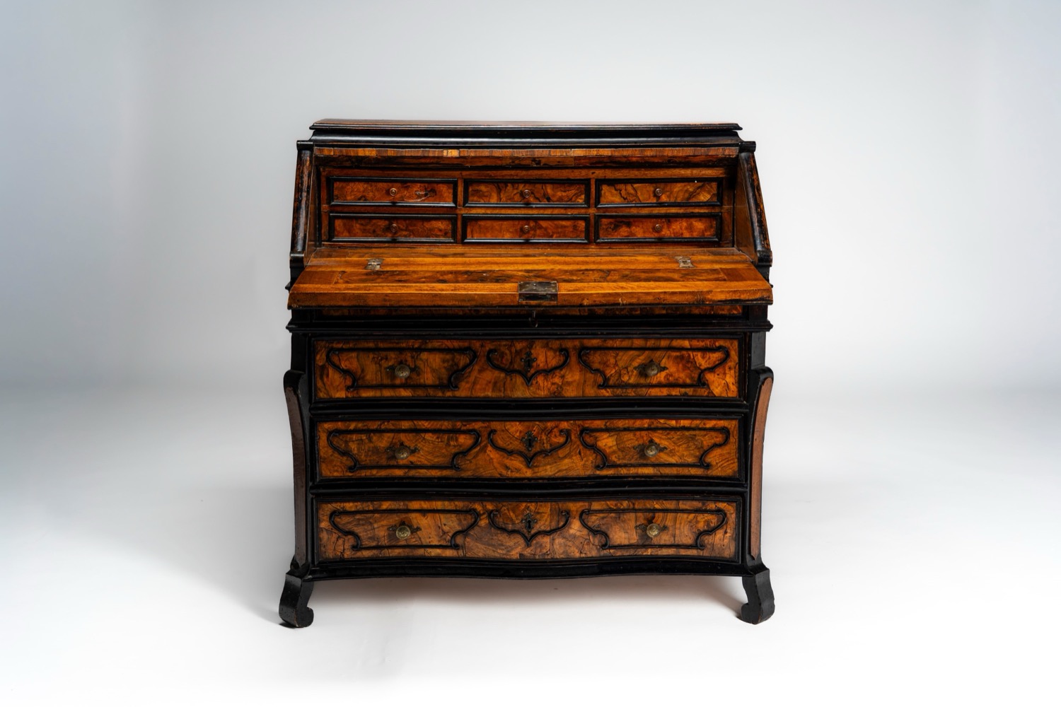 Cassettone a ribalta lastronato in noce e radica di noce a tre cassetti più uno a mezza altezza e calatoia celante sei tiretti. Decorato a cartelle sagomate con profili in legno ebanizzato, piedi a voluta. Lombardia, secolo XVIII