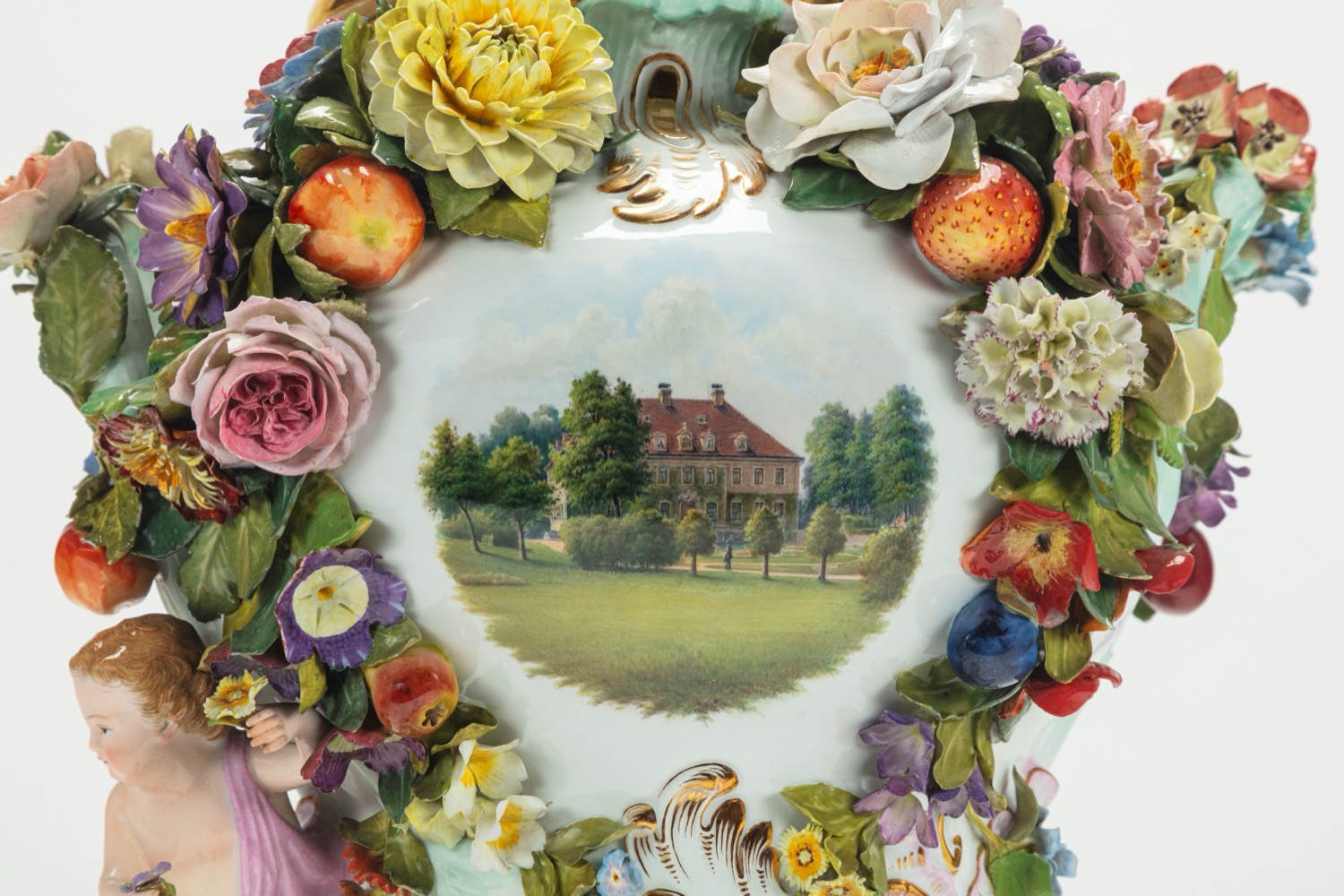 Vaso pot-pourri biansato con coperchio e base in porcellana policroma riccamente decorata a fiori, foglie, frutti e putti. Manifattura di Meissen, fine secolo XIX