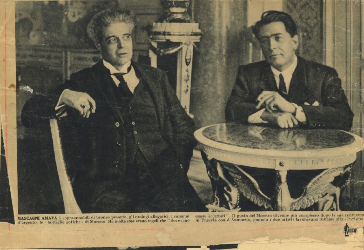 Guéridon in legno laccato a fondo bianco con base triangolare. Supporti a guisa di colonne a tutto tondo, sormontate da grifoni alati e dorati che reggono il piano con marmo incassato. Inizi XX secolo.Appartenuto al compositore Pietro Mascagni (1863–1945).