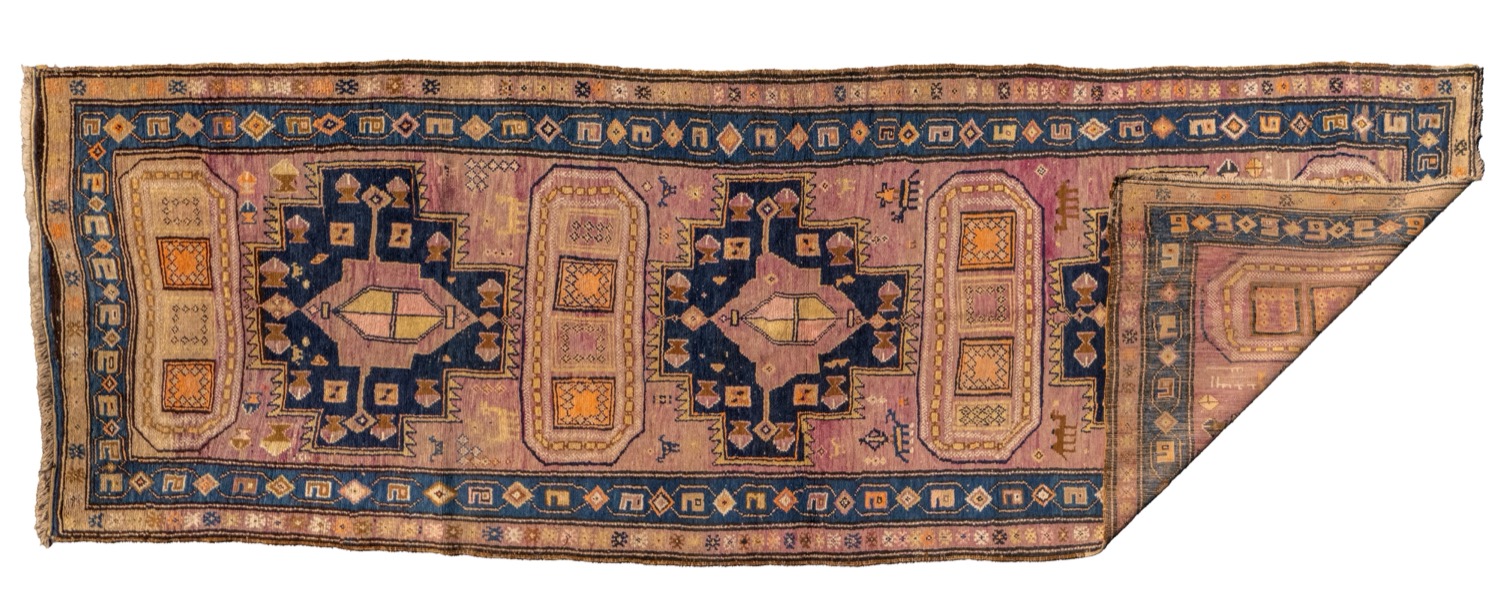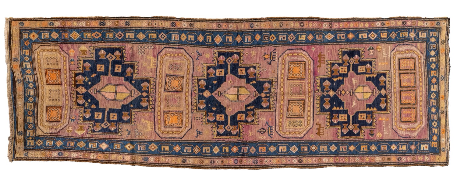 Restauri.fondo rosa con tre gradi medaglioni blu con elementi geometrici interni in giallo e arancio, bordura blu scuro a motivi geometrici stilizzati.