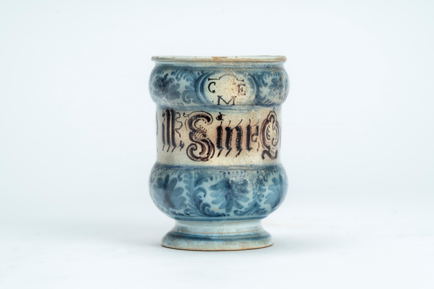 Albarello in maiolica con decoro blu cobalto a motivi vegetali interrotto da cartiglio con scritta apotecaria a caratteri gotici "Sine Quib", secolo XVIII