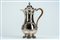 Caffettiera in argento 925 con corpo piriforme inciso e cesellato a motivi floreali, presa del coperchio a trottola, ansa mossa in rattan. Londra, 1774, England, London, 1774