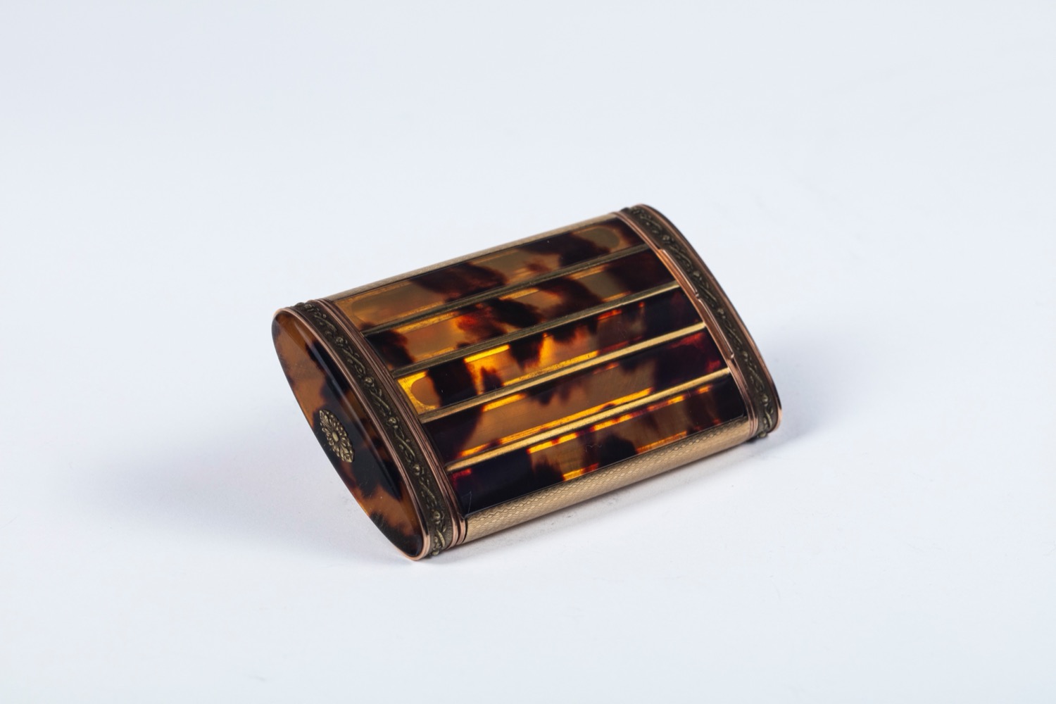 Lotto accompagnato da perizia per la tartaruga.montatura in oro cesellato a motivi vegetali e stilizzati, applicazioni a rosoni sul coperchio e sul fondo, incisa 18 K nella ghiera superiore.