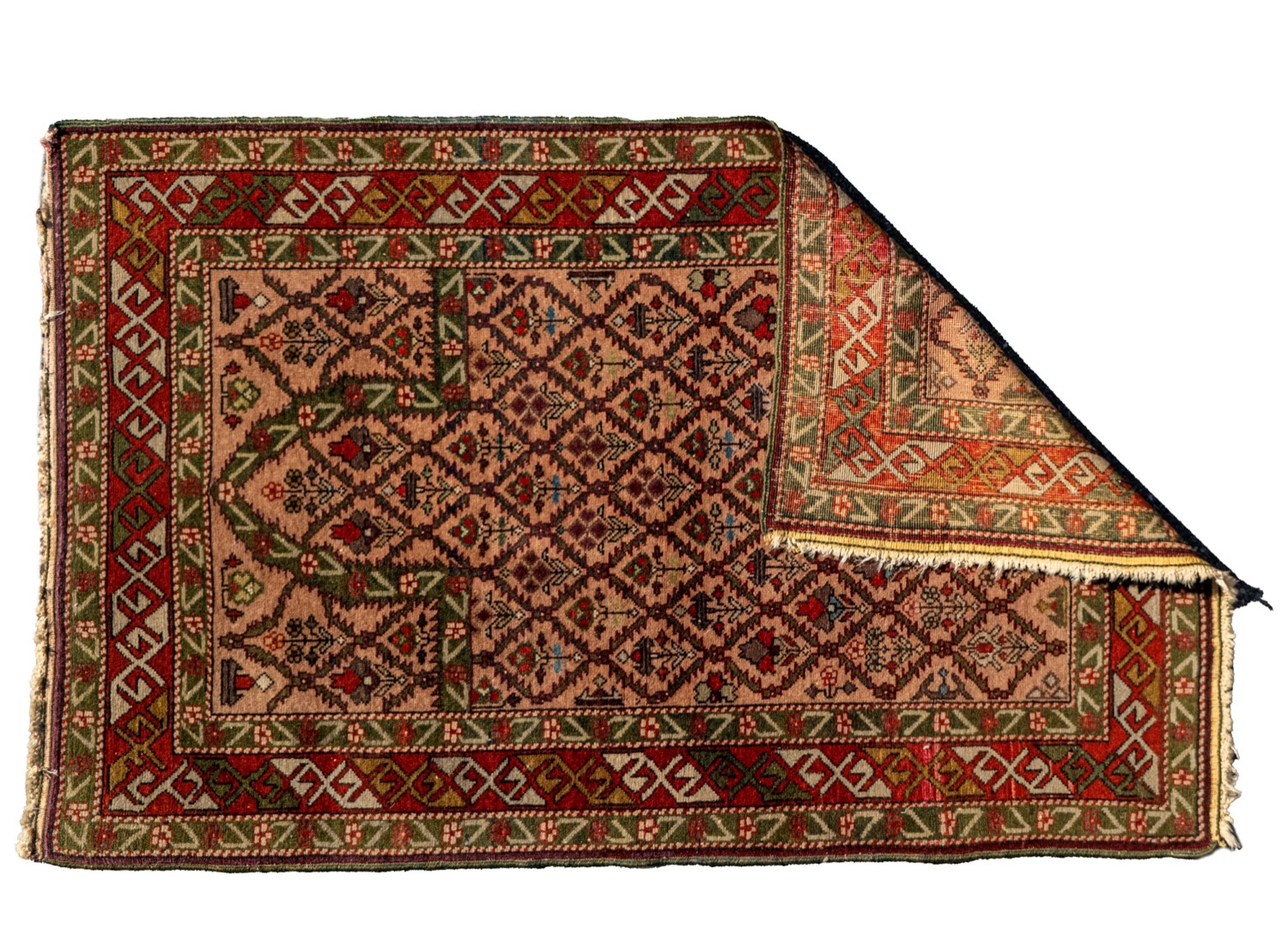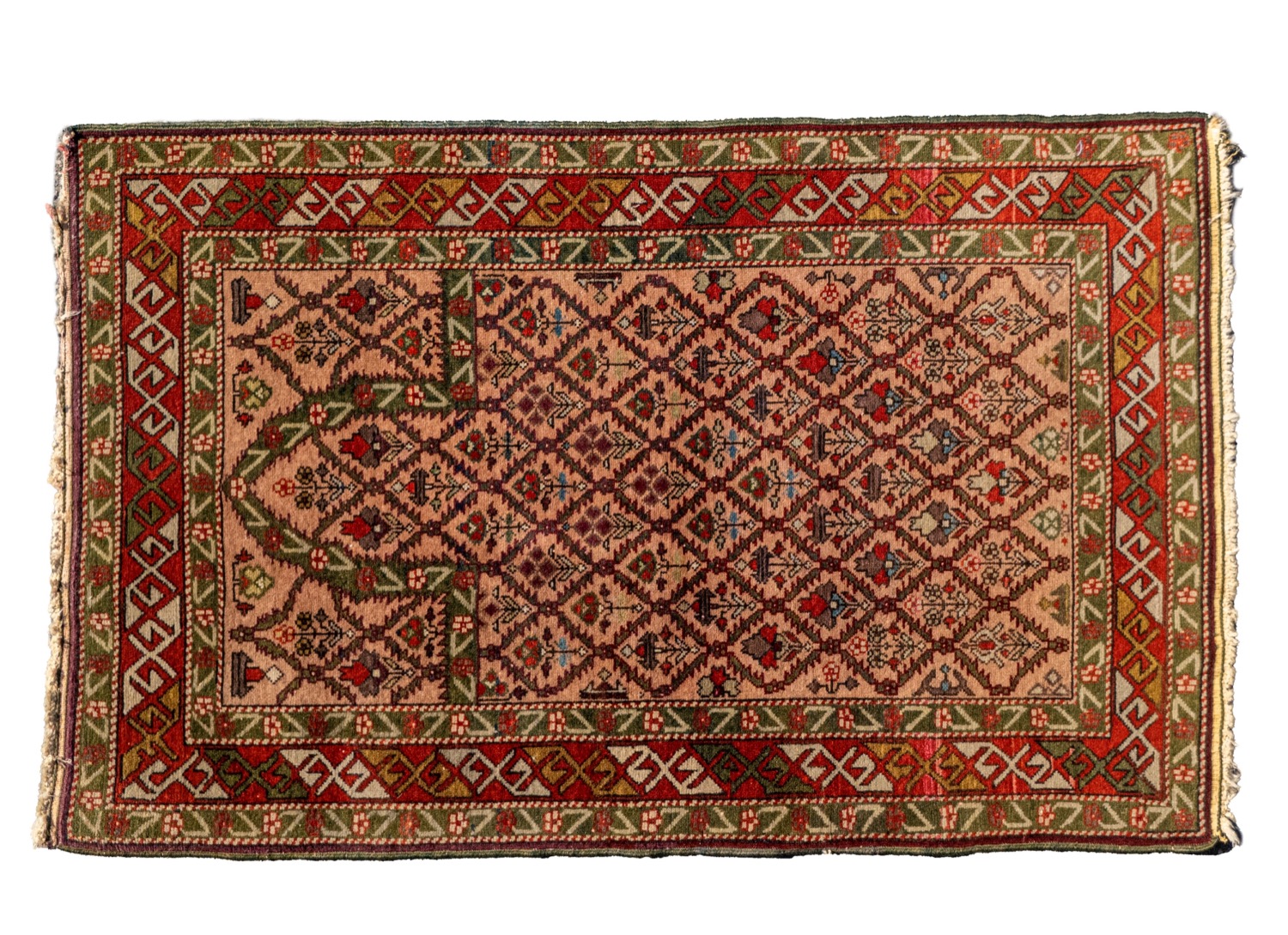 Restauri e difetti. Fondo avorio a piccoli rombi e elementi floreali stilizzati con mihrab verde oliva in alto, bordure a motivi geometrici policromi.