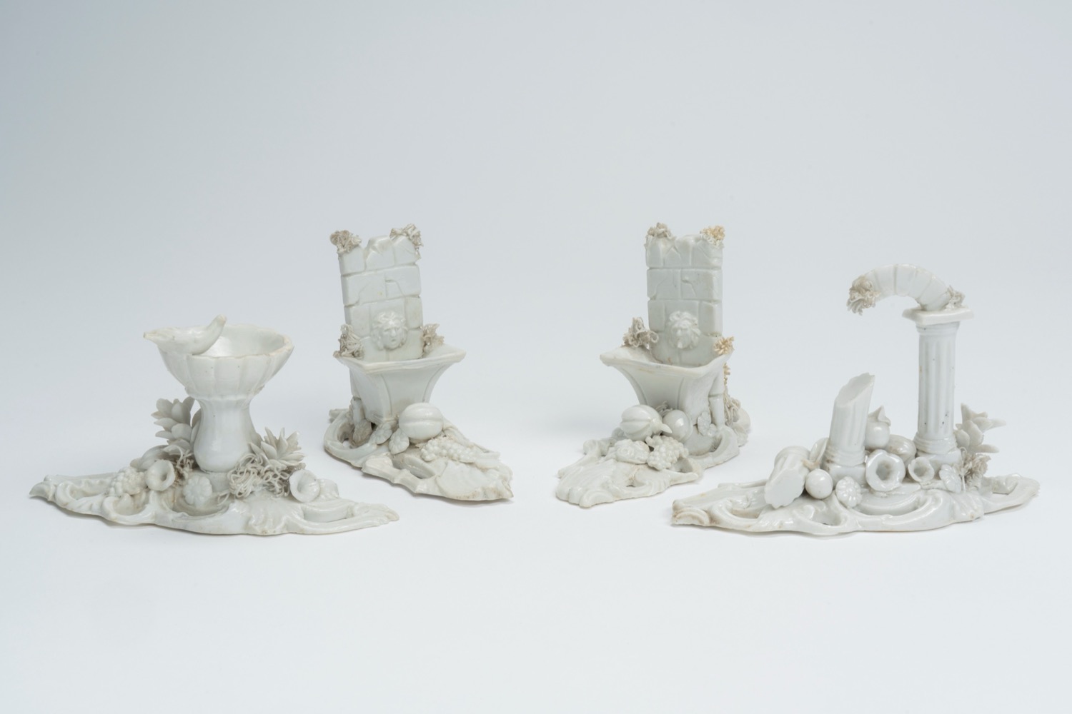 Quattro segnaposto in porcellana bianca a forma di capricci architettonici con frutti e fiori. Manifattura veneta, XVIII secolo.