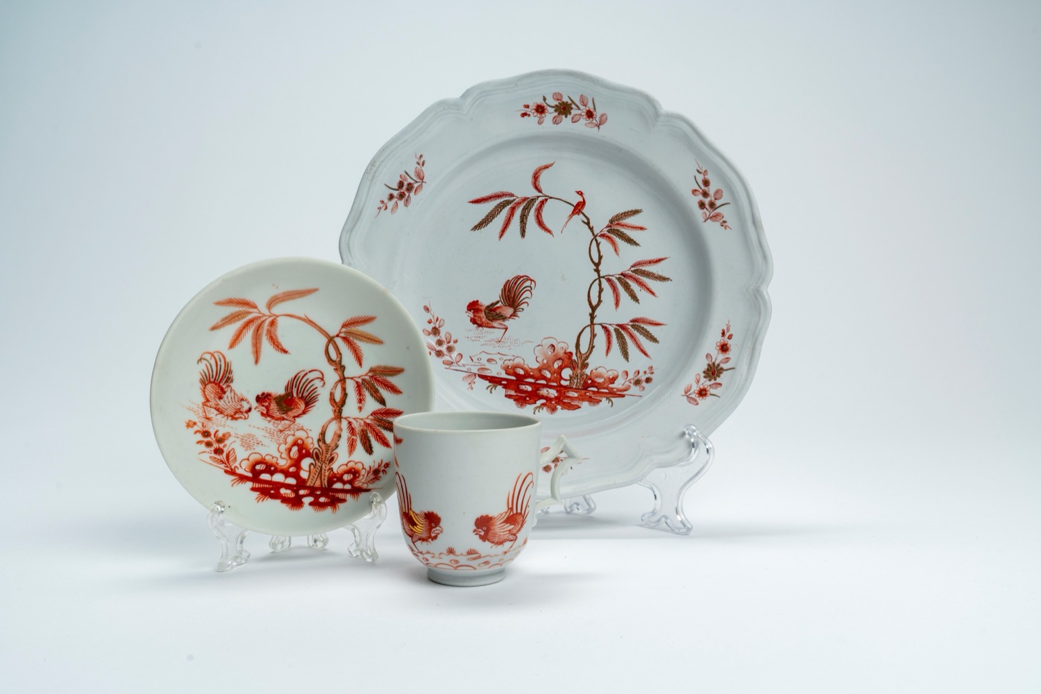 Tazzina da caffè con piattino e piatto in porcellana con decoro in rosso ferro e oro “al galletto”. Manifattura Ginori a Doccia, circa 1770