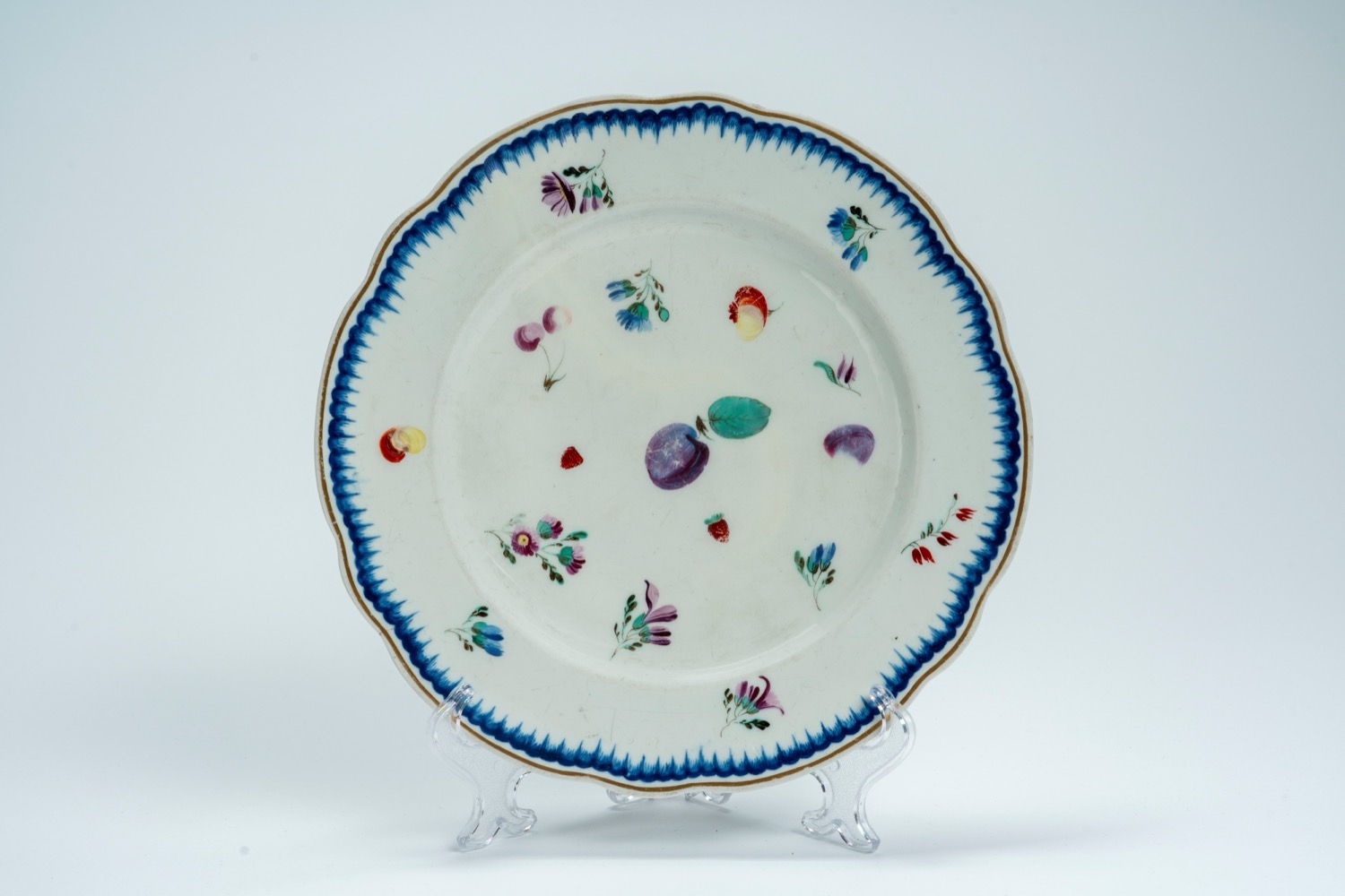 Il decoro “a fiori e frutti sparsi” è citato per la prima volta con questa denominazione negli elenchi di magazzino della fabbrica tra il 1780 e il 1788, ma fu ideato già intorno al 1770. Questa composizione, con fiori alternati a prugne, ciliegie, fragole, pere e altri piccoli frutti, deriva dagli studi dal vero delle maestranze della manifattura, ispirati dalle coltivazioni di piante ‘esotiche’ avviate a Doccia dal marchese Carlo.Profilo mistilineo con orlo dorato e motivo a pettine in blu di cobalto. Lievi difetti.