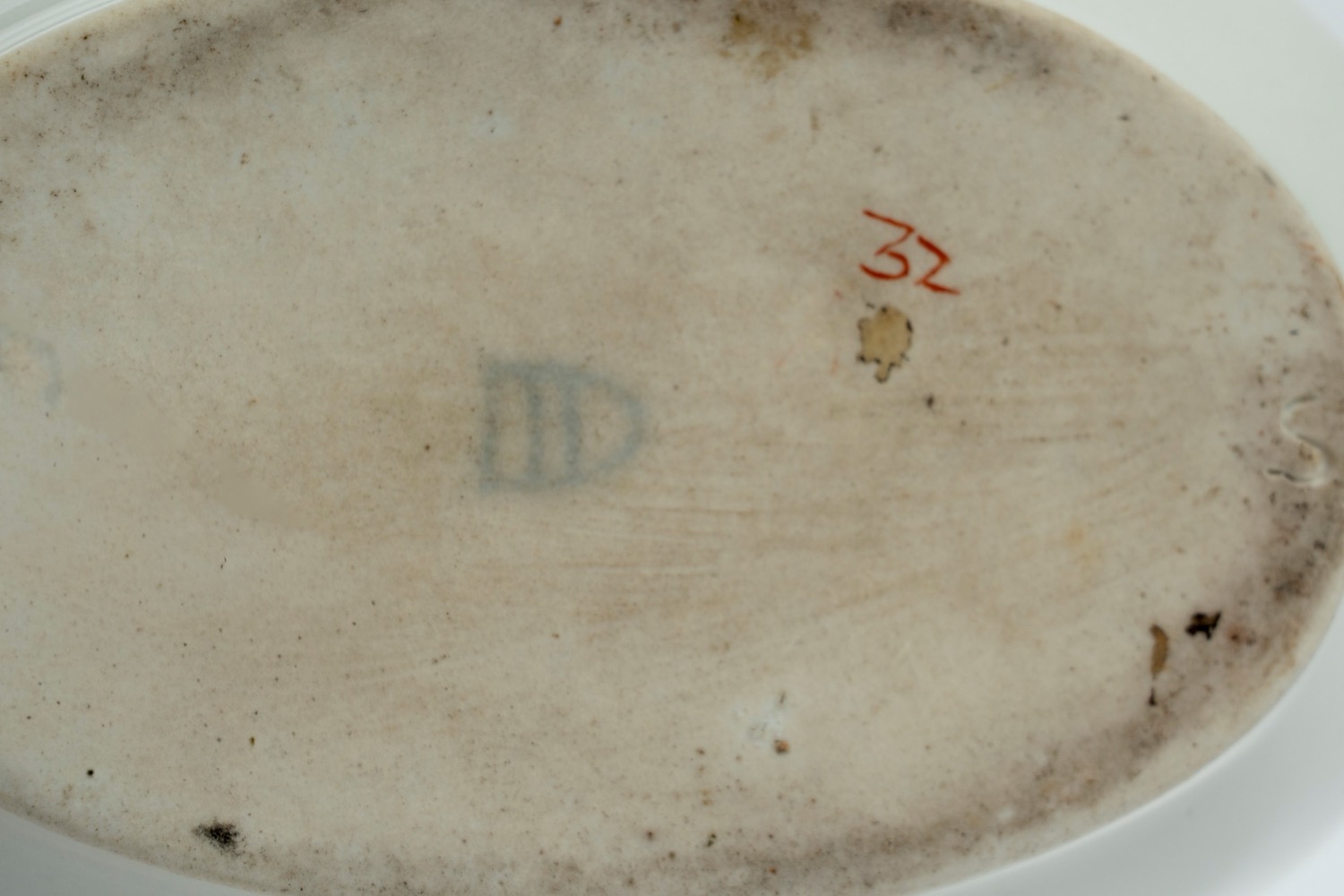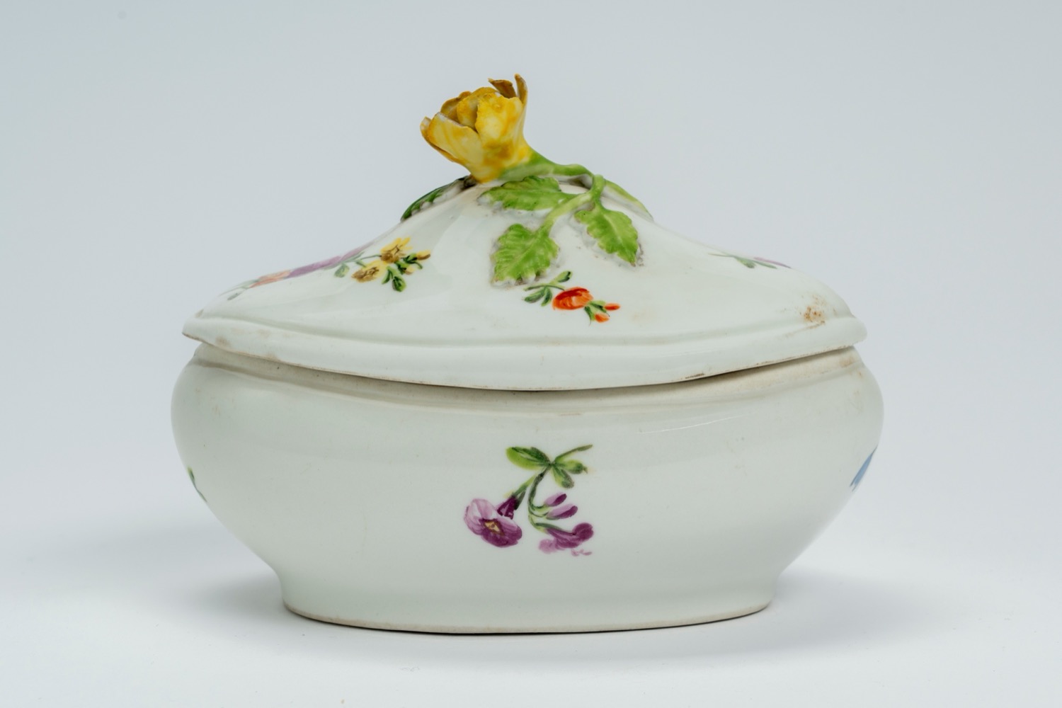 Di forma ovale e bombata, la presa del coperchio a fiore a tutto tondo con foglie all’attaccatura (lievi mancanze ai petali). Marca di fabbrica.Di forma ovale e bombata, la presa del coperchio a fiore a tutto tondo con foglie all’attaccatura (lievi mancanze ai petali). Marca di fabbrica.