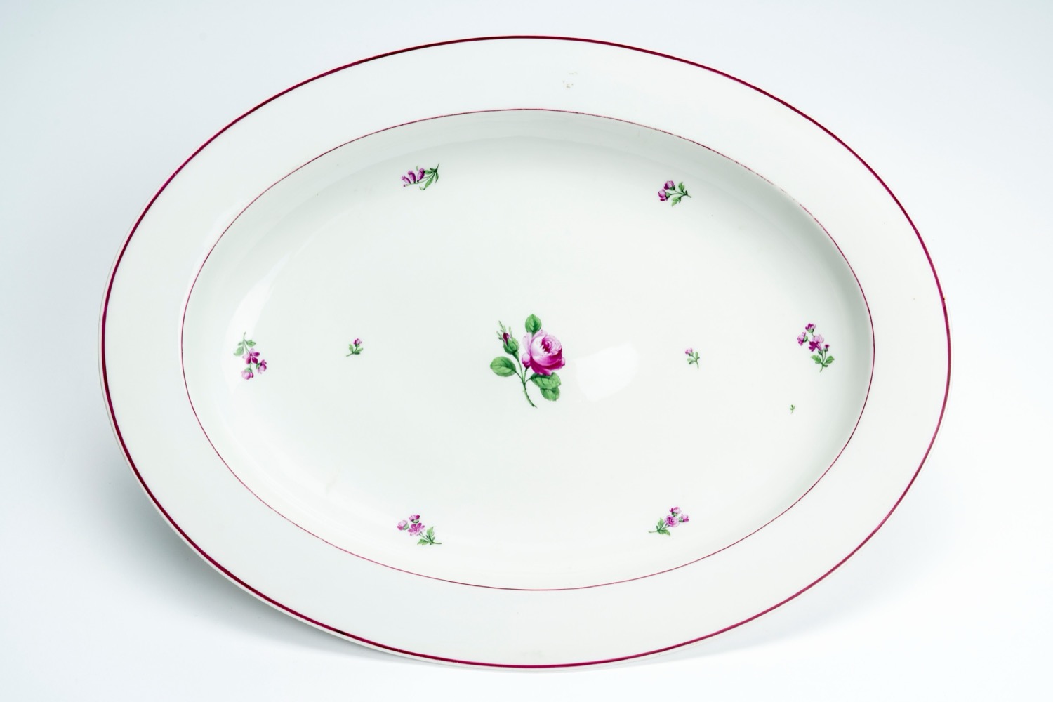 Grande vassoio ovale in porcellana decorato “alla rosa” con profili e rametti floreali nei toni del porpora. Vienna, inizio secolo XIX