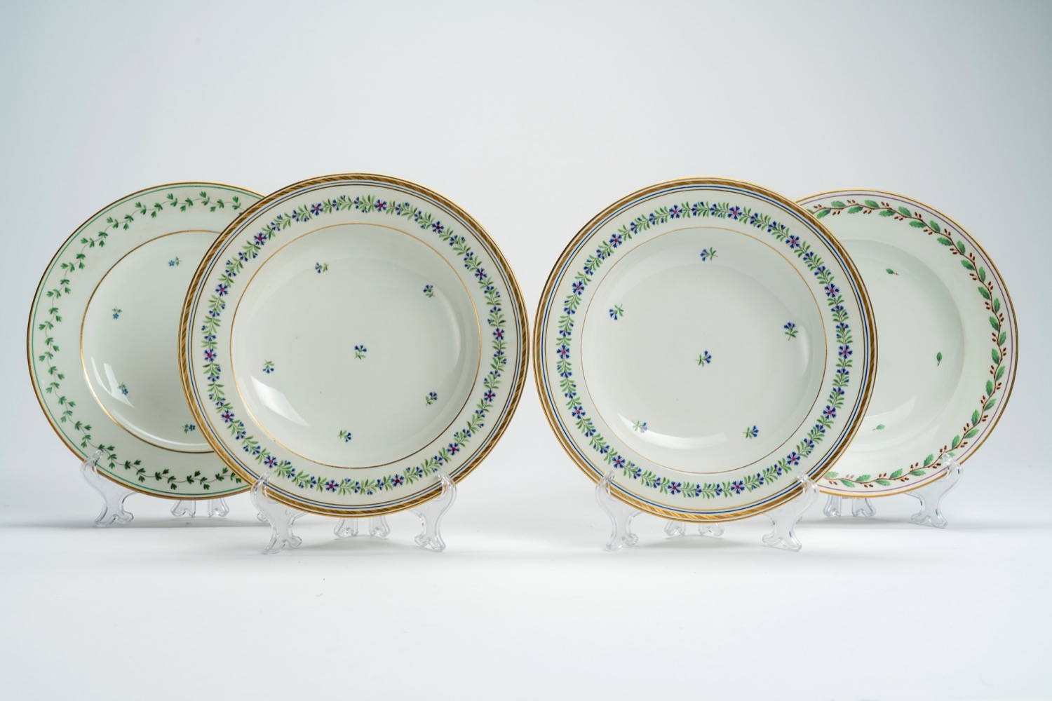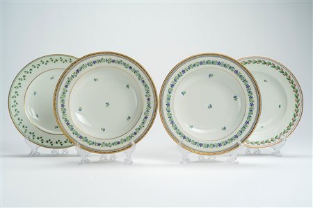 Lotto composto da una coppia di piatti fondi in porcellana decorati in policromia a fiordalisi sparsi e profilati in oro e da altri due piatti fondi con decoro a ghirlande di foglie e fiorellini sparsi con profili dorati. Vienna, fine secolo XVIII-inizio secolo XIX