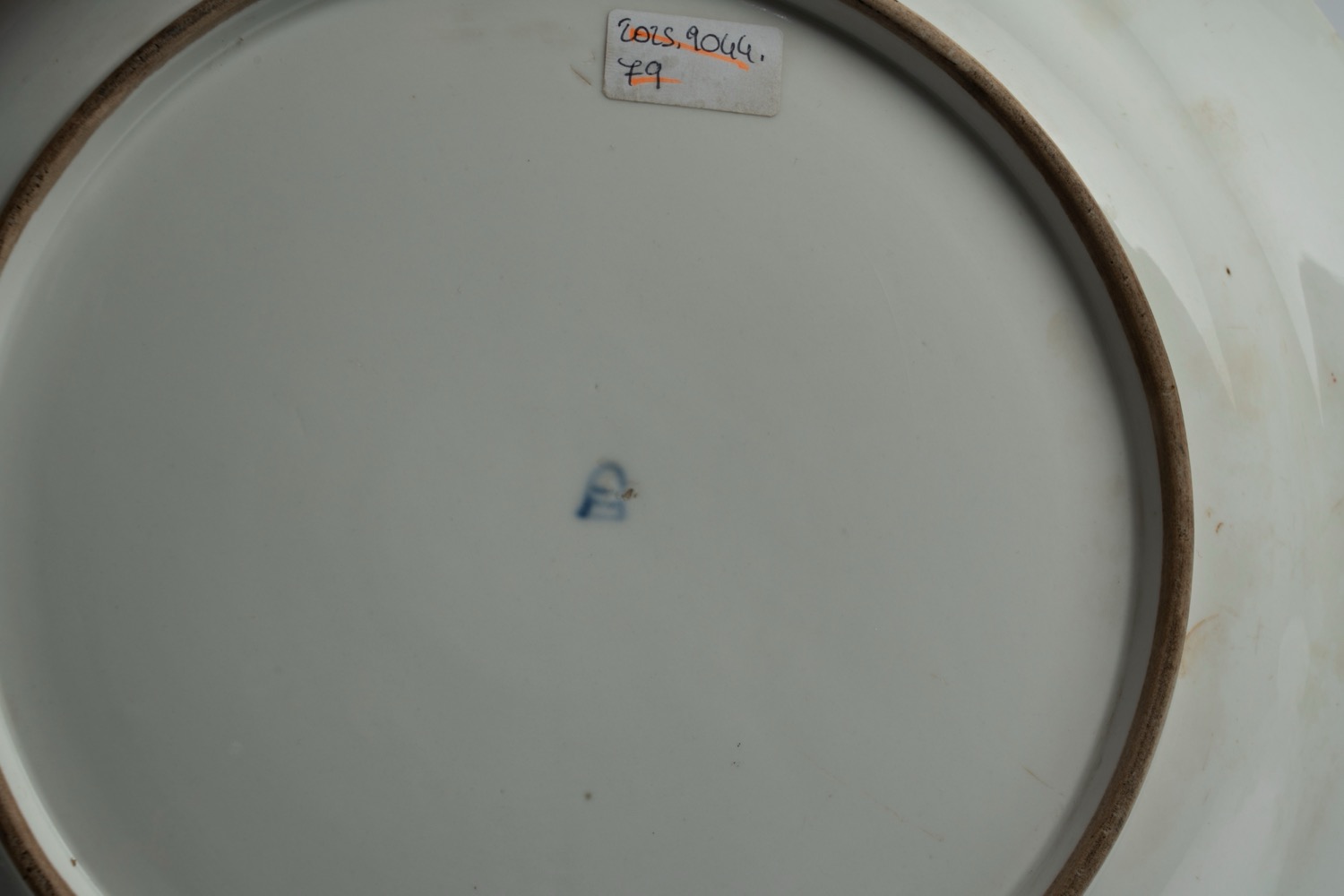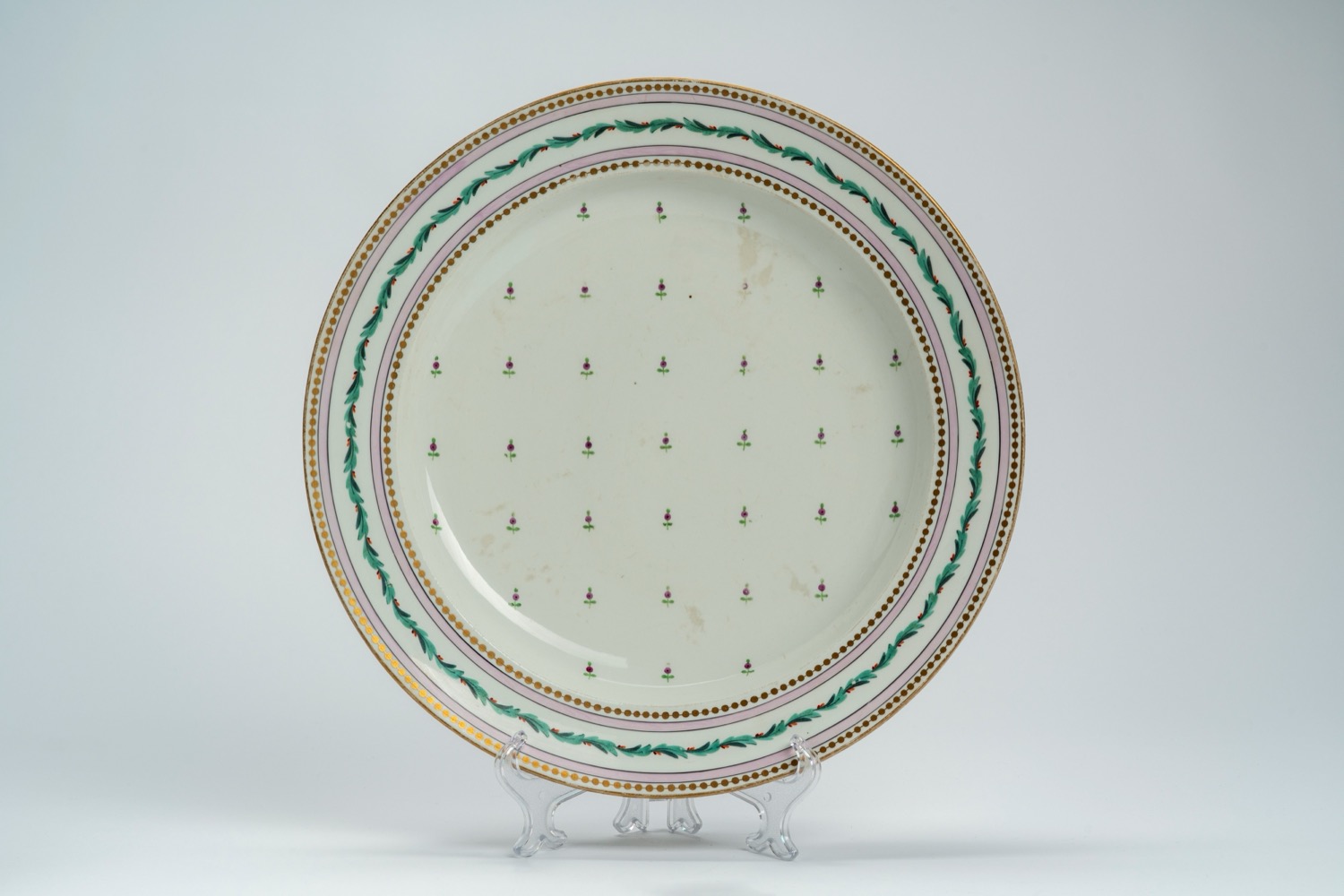 La falda con motivo continuo a ghirlanda tra due fasce rosa e due filetti perlinati in oro, la balza e il cavetto con fiorellini sparsi. Marca di fabbrica con numero inciso.La falda con motivo continuo a ghirlanda tra due fasce rosa e due filetti perlinati in oro, la balza e il cavetto con fiorellini sparsi. Marca di fabbrica con numero inciso.