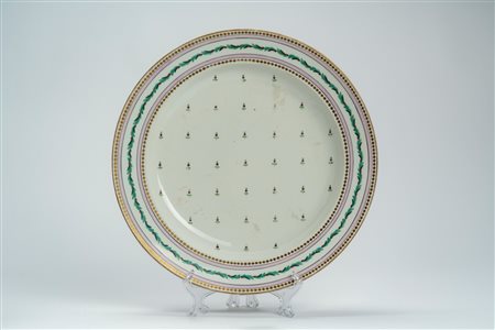 Piatto da portata in porcellana decorata in policromia e oro nei toni del verde e del rosa. Manifattura di Vienna, fine secolo XVIII