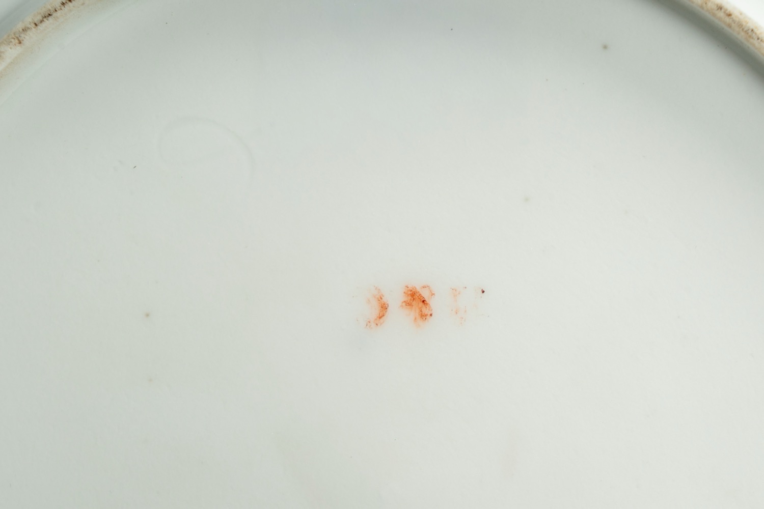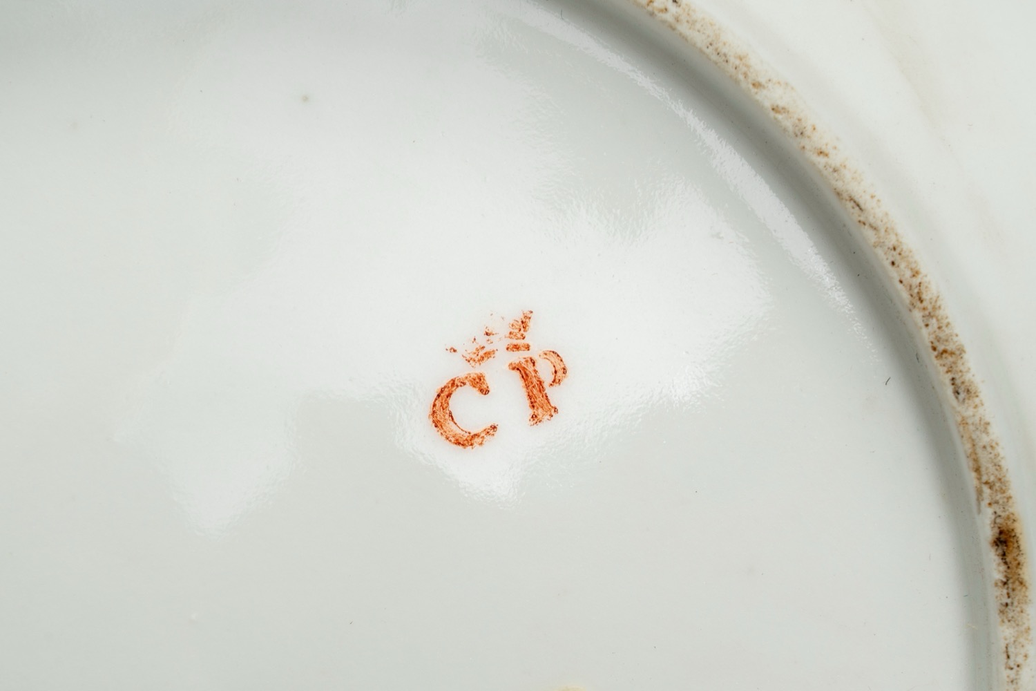 Cavetto centrato da bouquet di fiori, falda con rametti di fiori sparsi. Tre piatti con marca di fabbrica in blu (probabilmente manifattura Rue Amelot ?), quattro piatti con marca di fabbrica in rosso ferro “CP” coronato (Parigi, Faubourg Saint-Denis). Altri due piatti con marca in rosso ferro non identificabile. Lievi difetti.Cavetto centrato da bouquet di fiori, falda con rametti di fiori sparsi. Tre piatti con marca di fabbrica in blu (probabilmente manifattura Rue Amelot ?), quattro piatti con marca di fabbrica in rosso ferro “CP” coronato (Parigi, Faubourg Saint-Denis). Altri due piatti con marca in rosso ferro non identificabile. Lievi difetti.
