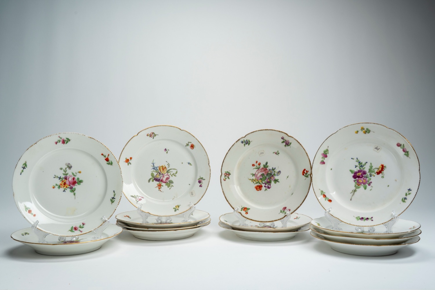 Tredici piatti piani in porcellana a bordo mosso e dorato decorati in policromia a mazzetto e fiori sparsi. Francia, fine secolo XVIII