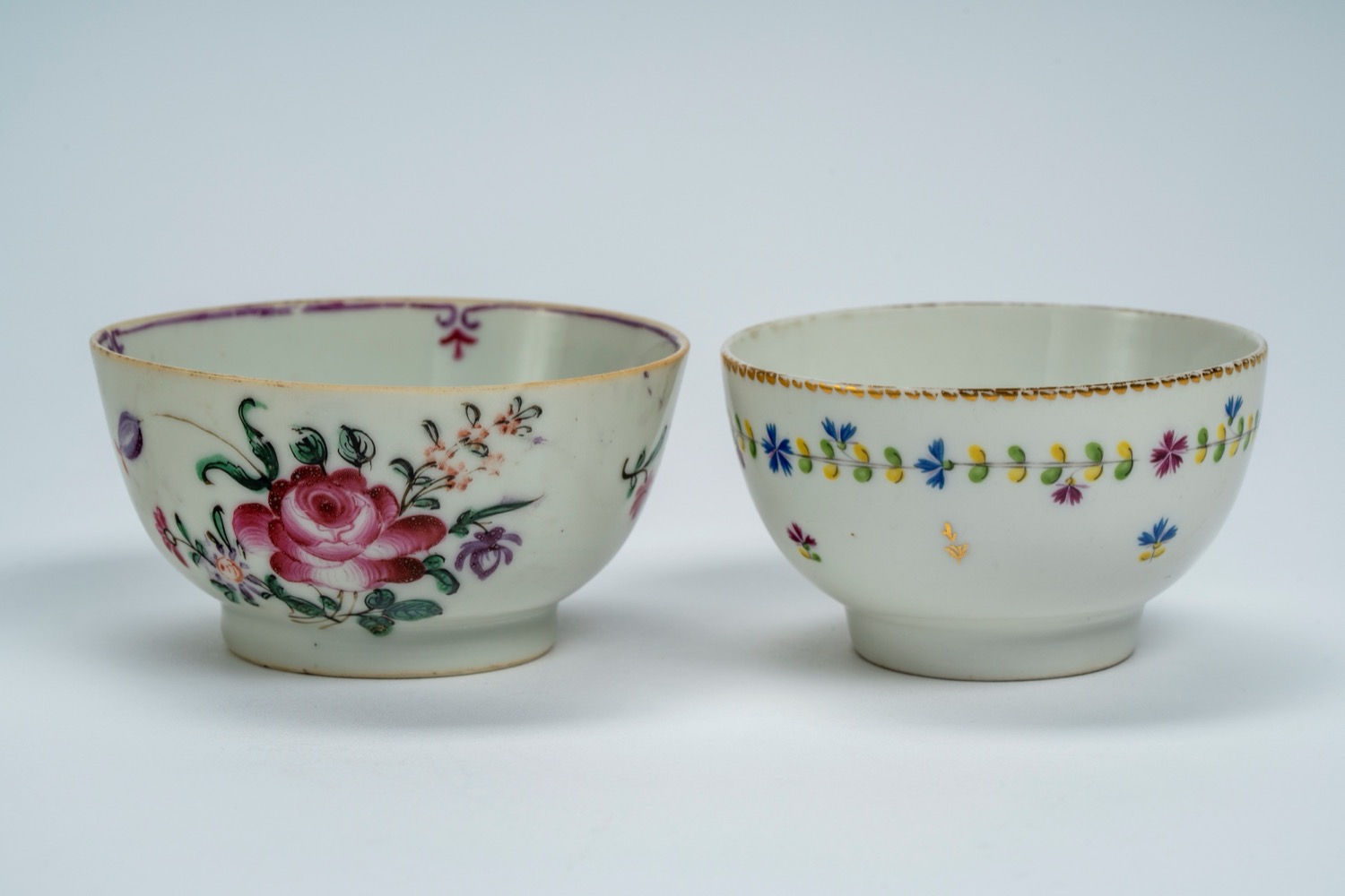 Due tazze in porcellana con decoro policromo a fiori. Una di manifattura Nyon, 1780–1790, l’altra probabilmente Vienna, secolo XVIII