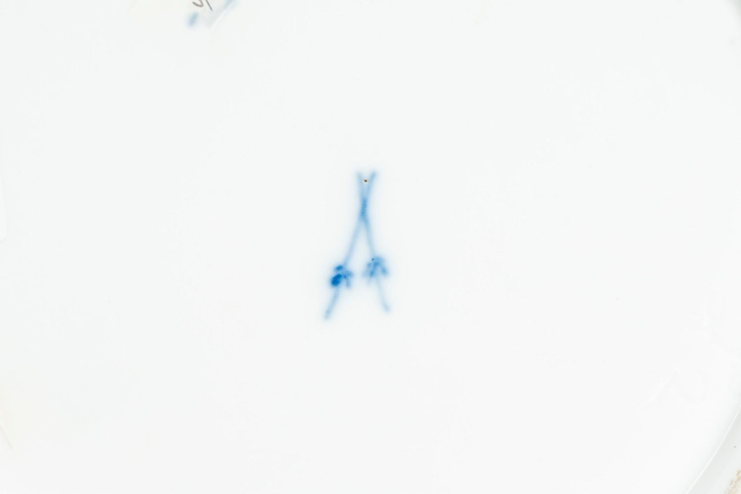 Entrambe su piede a disco, una con filetto dorato. Marca di fabbrica a torce incrociate in blu. Sbeccatura e felatura.Entrambe su piede a disco, una con filetto dorato. Marca di fabbrica a torce incrociate in blu. Sbeccatura e felatura.