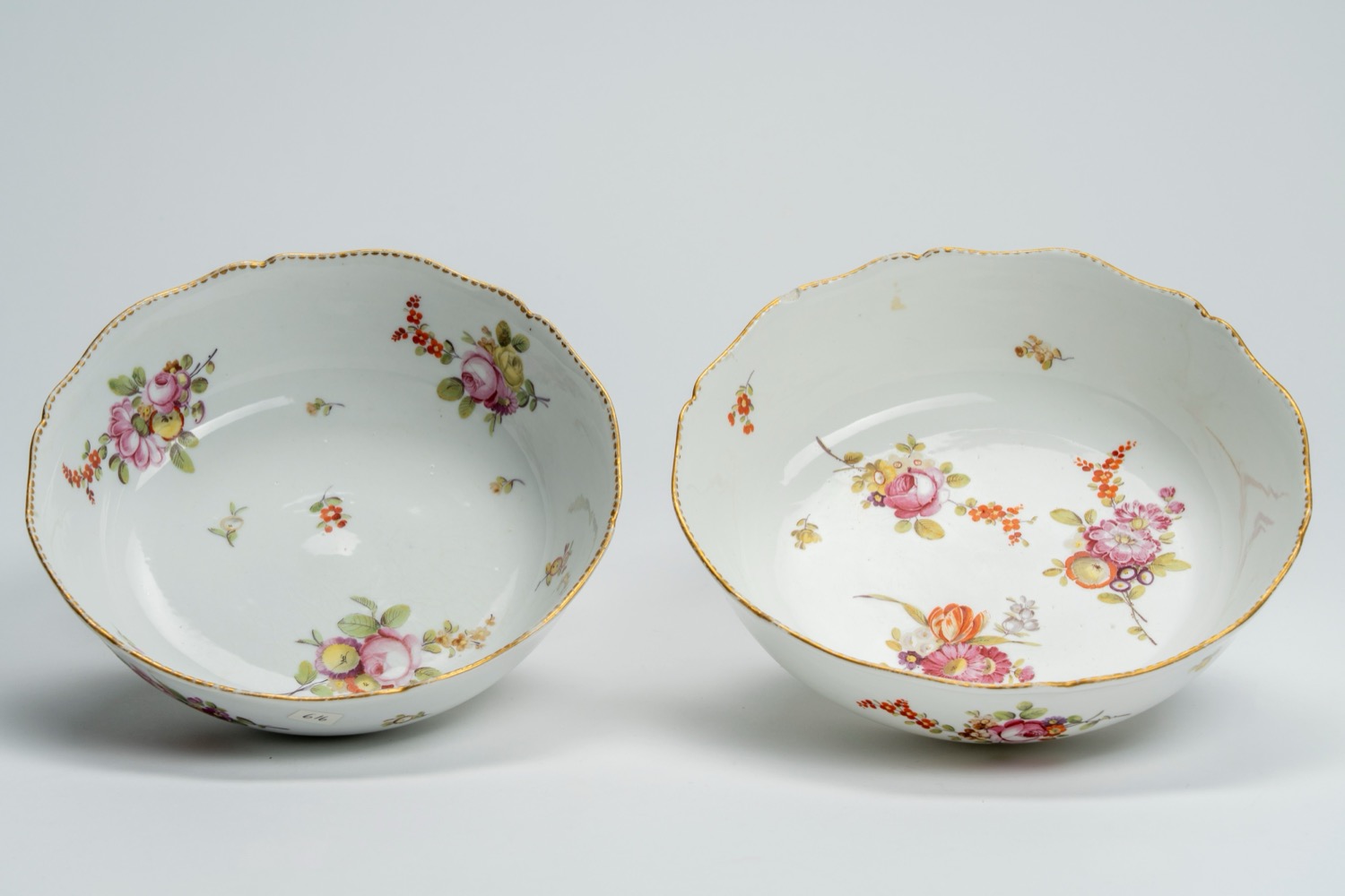 Due insalatiere a bordo mosso e dorato in porcellana decorata in policromia “al mazzetto” e a fiori sparsi. Parigi, La Courtille, manifattura Locré, fine secolo XVIII