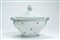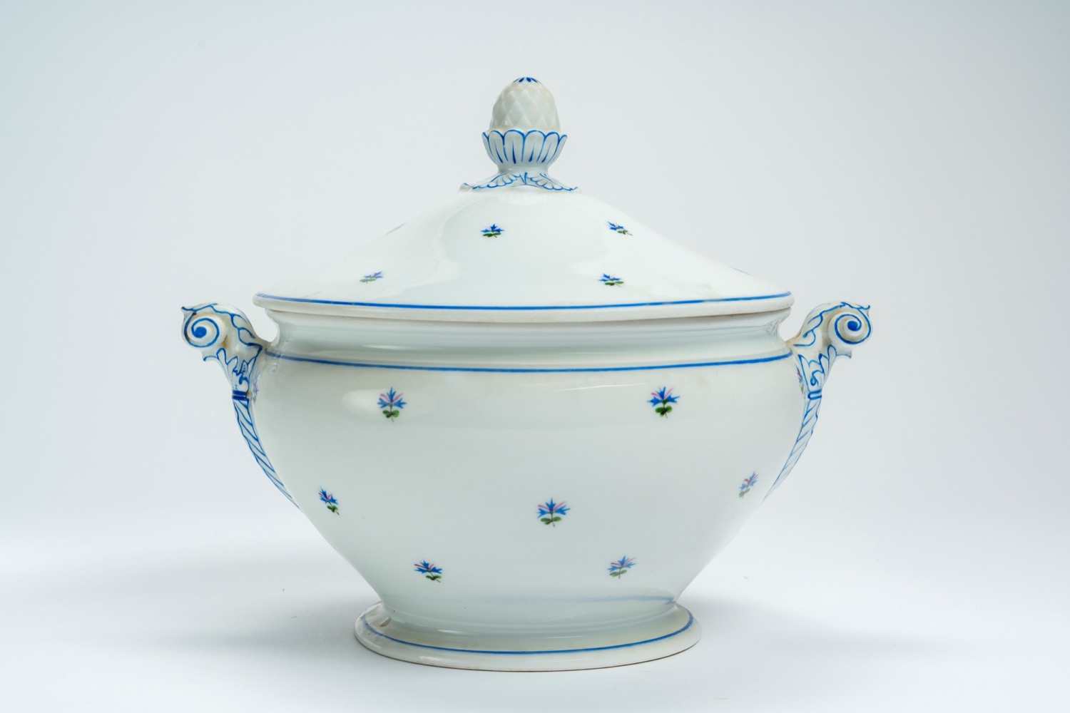 Zuppiera biansata con coperchio in porcellana decorata a fiordalisi e filettature blu di cobalto. Francia, metà secolo XIX