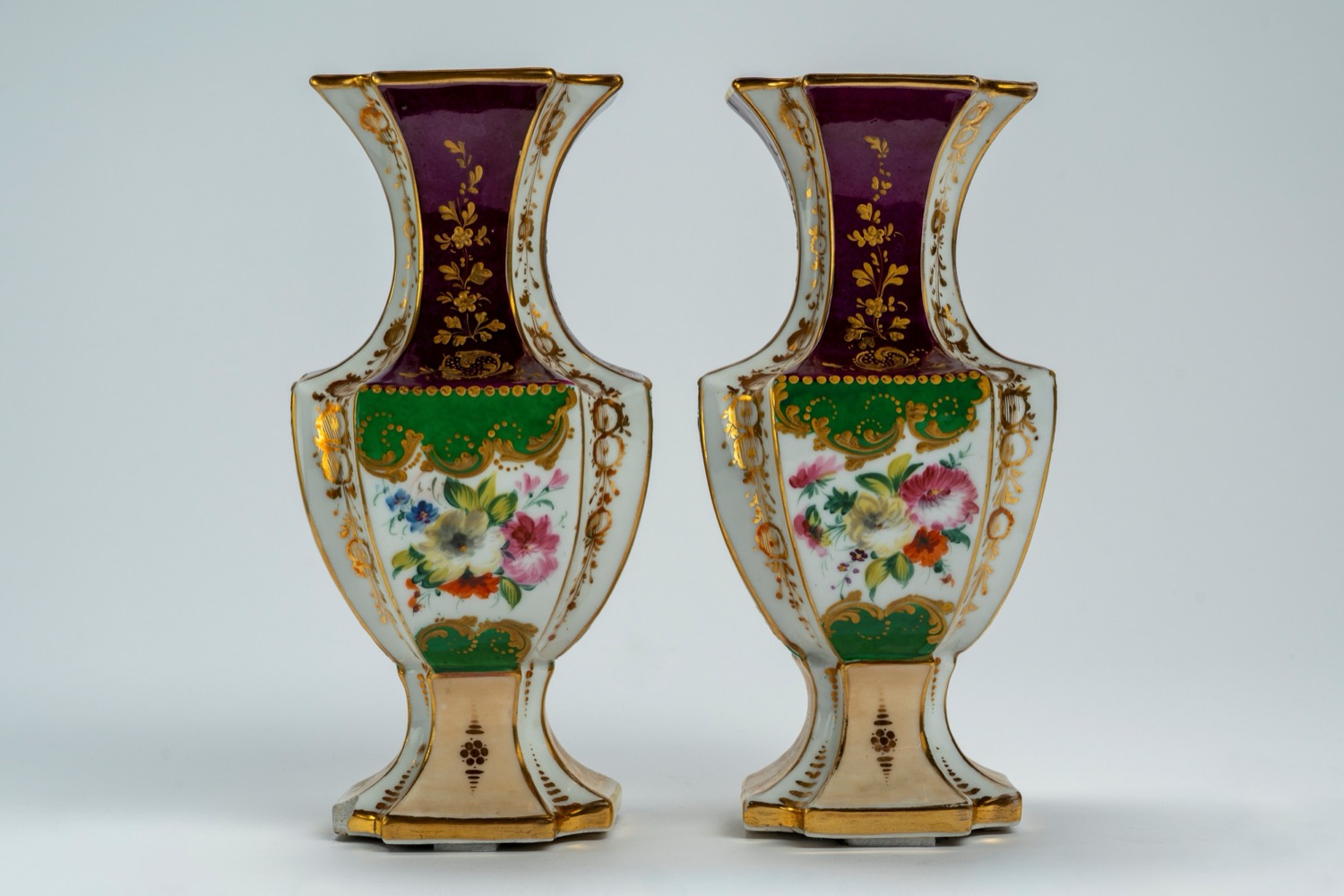 Coppia di vasi in porcellana policroma. Manifattura francese, metà secolo XIX