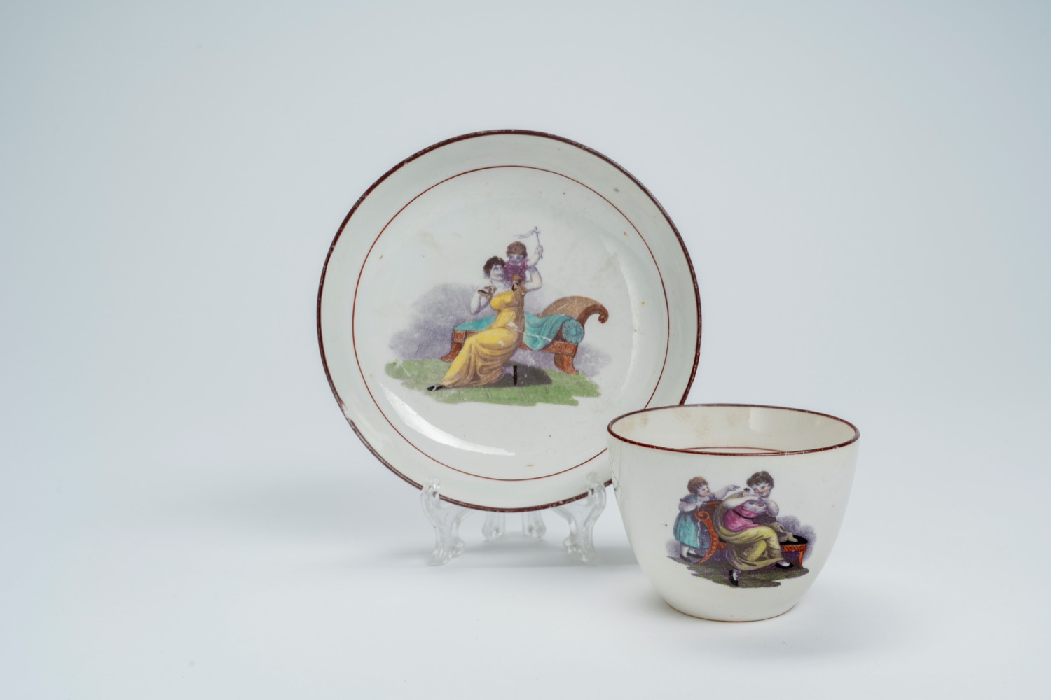 Tazza con piattino in porcellana decorata con scena neoclassica Regency stampata e dipinta da Adam Buck. Inghilterra, inizio secolo XIX