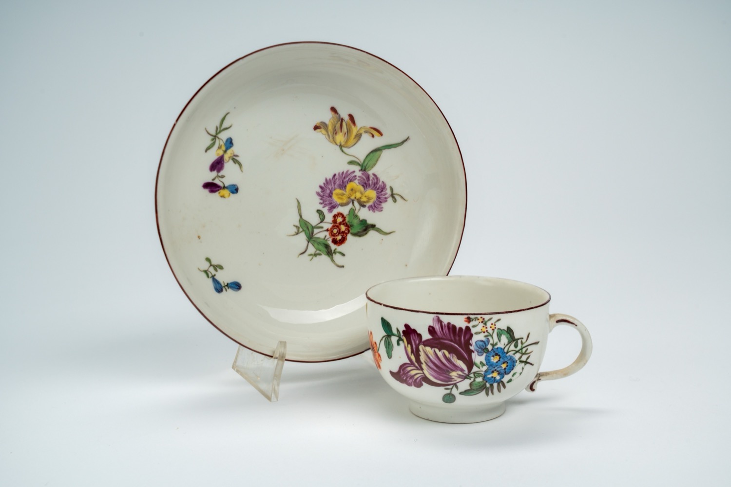Tazzina con piattino in porcellana con decoro policromo “al mazzetto” e a fiori sparsi. Manifattura di Ludwigsburg, 1760 circa