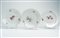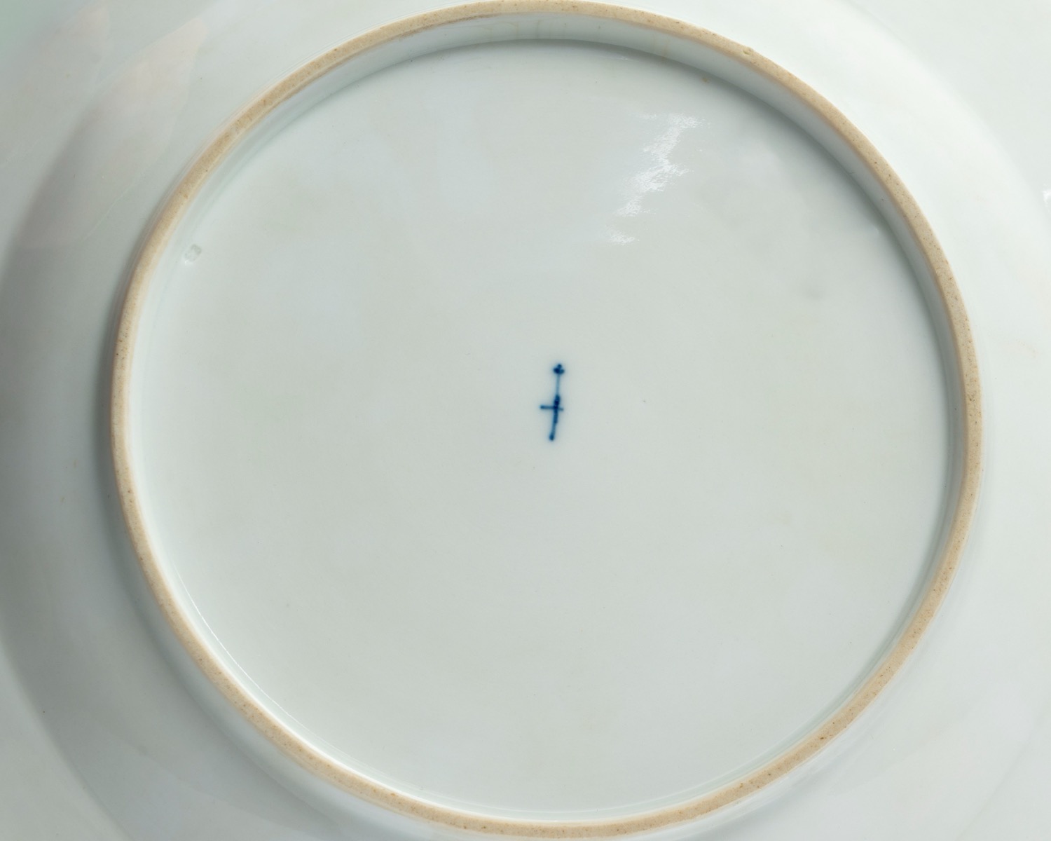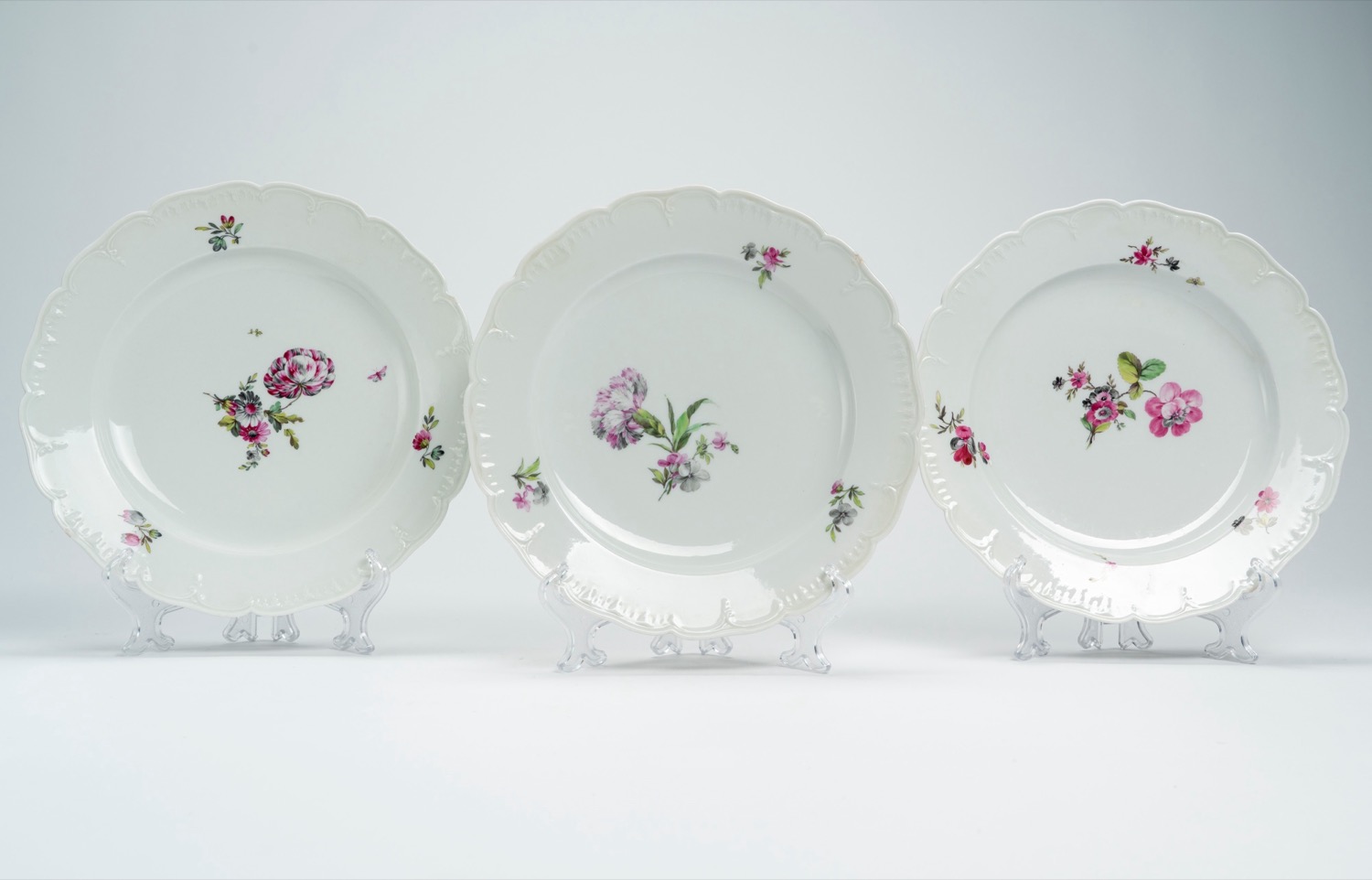 Tre piatti piani in porcellana a bordo mosso e a rilievo decorata in policromia a motivi floreali. Berlino, 1770 circa